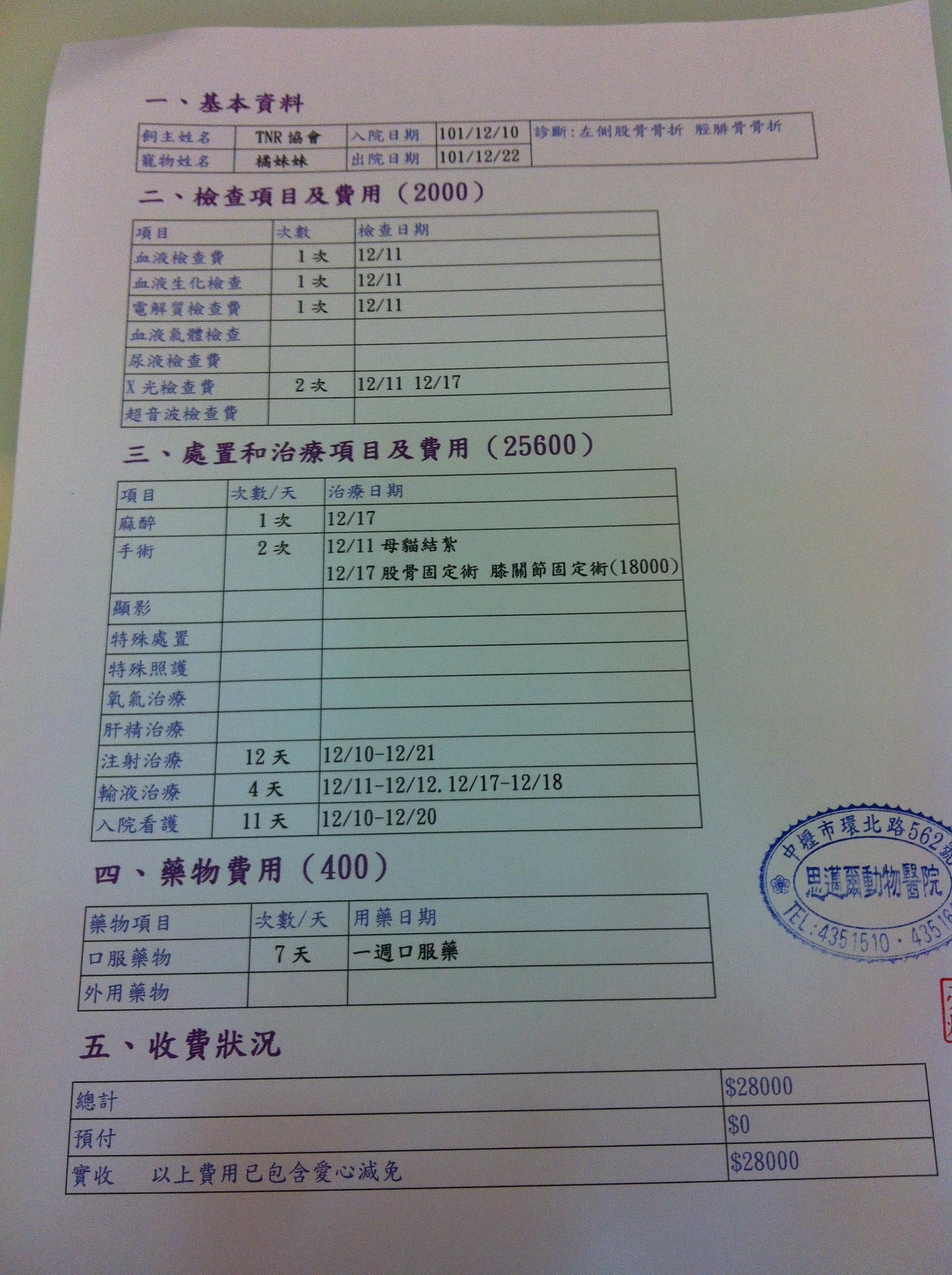 主題: 後腿二處斷裂的小橘妹妹 申請者姓名: 彭瑩瑩 花色: 申請日期: 2012-12-25 00:33:53 申請者部落格: 申請者臉書網址: 所在縣市/合作醫院: 桃園縣/思邁爾動物醫院 治療費用: 28000元 需求人數: 30人 已結案 (2013-08-06 13:45:45) 報名人員: Jerry(已付款)、May Chuang(已付款)、丁小丁(已付款)、Cherry Hsu(已付款)、Eli Tsao(已付款)、Eli Tsao(已付款)、游妃妃(已付款)、Ma Yi(已付款)、杜杜(已付款)、leezu(已付款)、Lin YC(已付款)、Eliza Chen(已付款)、Wanhua Chan(已付款)、Molly Cheng(已付款)、Doris Chen、Yu-Chen Lee(已付款)、miraai(已付款)、陳阿條(已付款)、Mia Wei(已付款)、存錢筒(已付款)、丁小乖(已付款)、周振禮(已付款)、Doris(已付款)、yin(已付款)、Andrea Lin(已付款)、Vickie(已付款)、Raymond Kuo(已付款)、田馨(已付款)、阿修(已付款)、Vozaponmi Cheer(已付款)、okina、Weirong(已付款)、 候補人員: 動物病情說明: 這隻橘妹妹是我在餵養的浪浪,受到不明外力的撞擊(疑似車禍)而造成後左腿的嚴重骨折:小腿和大腿都斷裂。