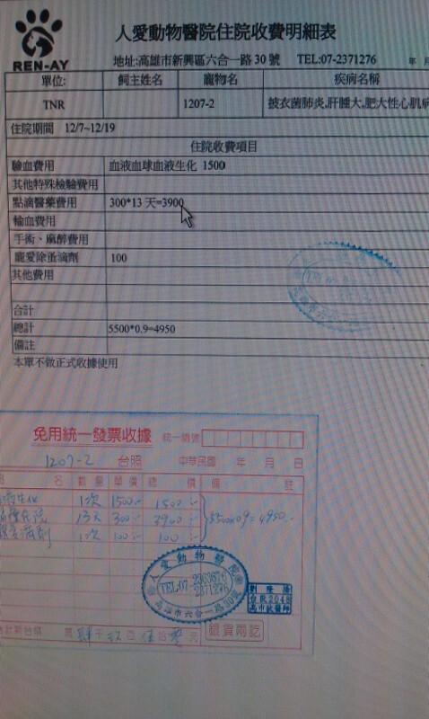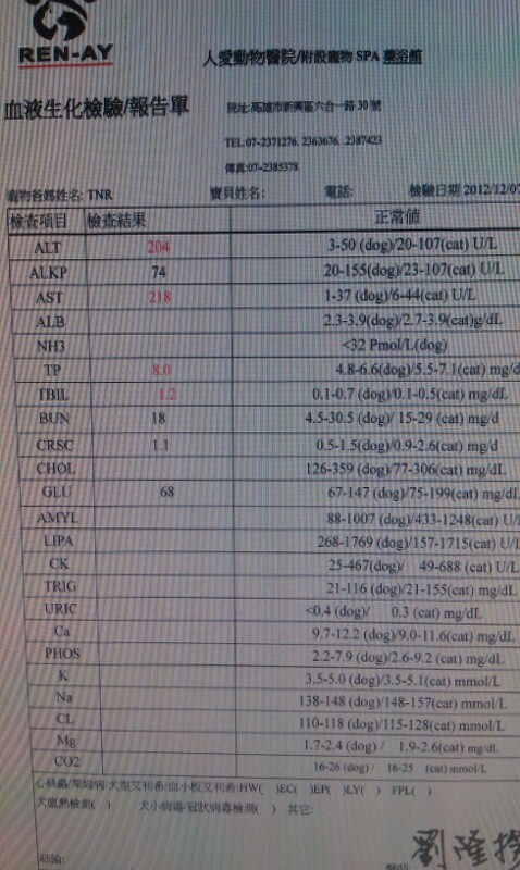 主題: 武廟 感染披衣菌肺炎 ,肝指數爆高(肝腫大)貓咪 申請者姓名: 陳露露 花色: 申請日期: 2012-12-25 07:46:45 申請者部落格: 申請者臉書網址: 所在縣市/合作醫院: 高雄市/人愛動物醫院 治療費用: 4950元 需求人數: 12人 已結案 (2013-06-27 14:08:04) 報名人員: Jennifer Tsou(已付款)、Eason(已付款)、Jerry(已付款)、愛貓婷(已付款)、柳燕燕(已付款)、Eli Tsao(已付款)、陳念芸(已付款)、陳念芸(已付款)、Yuyu Amy Wu(已付款)、Cheryl Chi Chi、Justin Verlander(已付款)、Maru Meow(已付款)、楊小嬅(已付款)、 候補人員: 動物病情說明: 最近武廟市場改建, 造成空成的貓咪四散, 有些貓來到志工的餵養區, 所以誘捕到醫院結紮. 可能因為覓食不易抵抗力不佳, 所以有流鼻涕,嚴重咳嗽的症狀. 進一步驗血後判斷應是近日流行的披衣菌肺炎,肝指數爆高(肝腫大),持續醫療終於觀察出一個結果,此貓的喘咳除了肺炎,還合併肥大性心肌病,咳嗽有雜音是來自於心臟,這是永久性心臟病,心因性咳嗽隨著會存在,必須一直吃藥控制~目前鼻水噴涕這部份已治療到一個程度~目前已經復原了. 由志工帶回並繼續觀察. 明細如下: