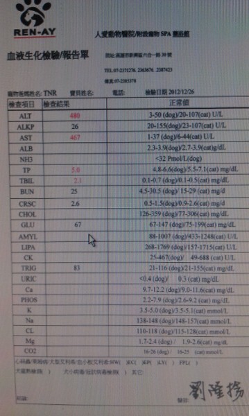 主題: 鳳山 黃埔新村 口炎 鼻膿 子宮潰爛 眼球紫色 申請者姓名: 徐熒葳 花色: 申請日期: 2013-01-07 07:42:09 申請者部落格: 申請者臉書網址: 所在縣市/合作醫院: 高雄市/人愛動物醫院 治療費用: 4140元 需求人數: 5人 已結案 (2013-02-23 11:58:53) 報名人員: Vita Yang(已付款)、MINI(已付款)、midori(已付款)、Hsin Yu Liao(已付款)、上官玉喵(已付款)、 候補人員: 動物病情說明: 鳳山黃埔新村 送至人愛動物醫院結紮的貓咪, 醫生手術時發現: 1.子宮不明原因潰爛(已摘除) 2.嚴重口腔炎(不知是否影響咀嚼), 3. 眼屎鼻膿(實際生成原因還要驗血確診)眼球已經腫成紫色. 醫院進行血檢並觀察<貓咪有血小板減少症, 肝腫大,口腔潰瘍, 鼻支氣管炎> 陸續還有拉肚子, 在治療後已經痊癒了, 沒流鼻涕&咳嗽了. 一開始可能是口腔在痛不太敢吃東西~現在也能正常飲食~經醫生評估可以出院.