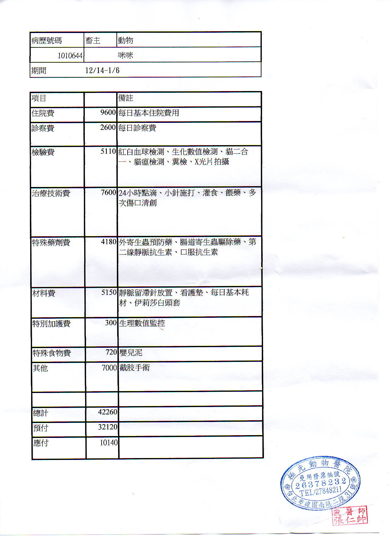 主題: 永和~被捕獸夾夾斷前肢的咪咪 申請者姓名: 張育熏 花色: 申請日期: 2013-01-14 21:29:50 申請者部落格: 申請者臉書網址: http://www.facebook.com/Ophelia.tw.tw 所在縣市/合作醫院: 台北市/其他院所醫助專案(醫院請先MAIL溝通) 治療費用: 42260元 需求人數: 43人 已結案 (2013-06-27 14:15:57) 報名人員: Lady Meowmeow(已付款)、Elaine Chuang(已付款)、yushi0304(已付款)、Maureen Huang(已付款)、王美美(已付款)、iMADOKA(已付款)、Agi Lin(已付款)、小熏(已付款)、小熏(已付款)、小熏(已付款)、張曉倩(已付款)、坑長(已付款)、Yen-Yuan Wang(已付款)、小盈(已付款)、kelly(已付款)、kelly(已付款)、Amy(已付款)、波波(已付款)、Nancy(已付款)、ztsai(已付款)、甘茴香(已付款)、Jade Lee(已付款)、林杰賦、Jennifer Tsou(已付款)、Mia Wei(已付款)、Hui Mei Chen(已付款)、Hui Mei Chen(已付款)、Rakura Lo(已付款)、林宸誼(已付款)、dplantis(已付款)、游妃妃(已付款)、red hair(已付款)、Eli Tsao(已付款)、閻永安(已付款)、沛橙李(已付款)、Nicole Lee(已付款)、Cathy25(已付款)、Yuchung Liu(已付款)、Satsuki Igarashi(已付款)、伶伶(已付款)、劉阿發(已付款)、Vanessa Cheng(已付款)、Cindy Kenny(已付款)、Regina Jian(已付款)、 候補人員: 動物病情說明: 2012.12.13晚上我們聽到拖著鐵的聲音