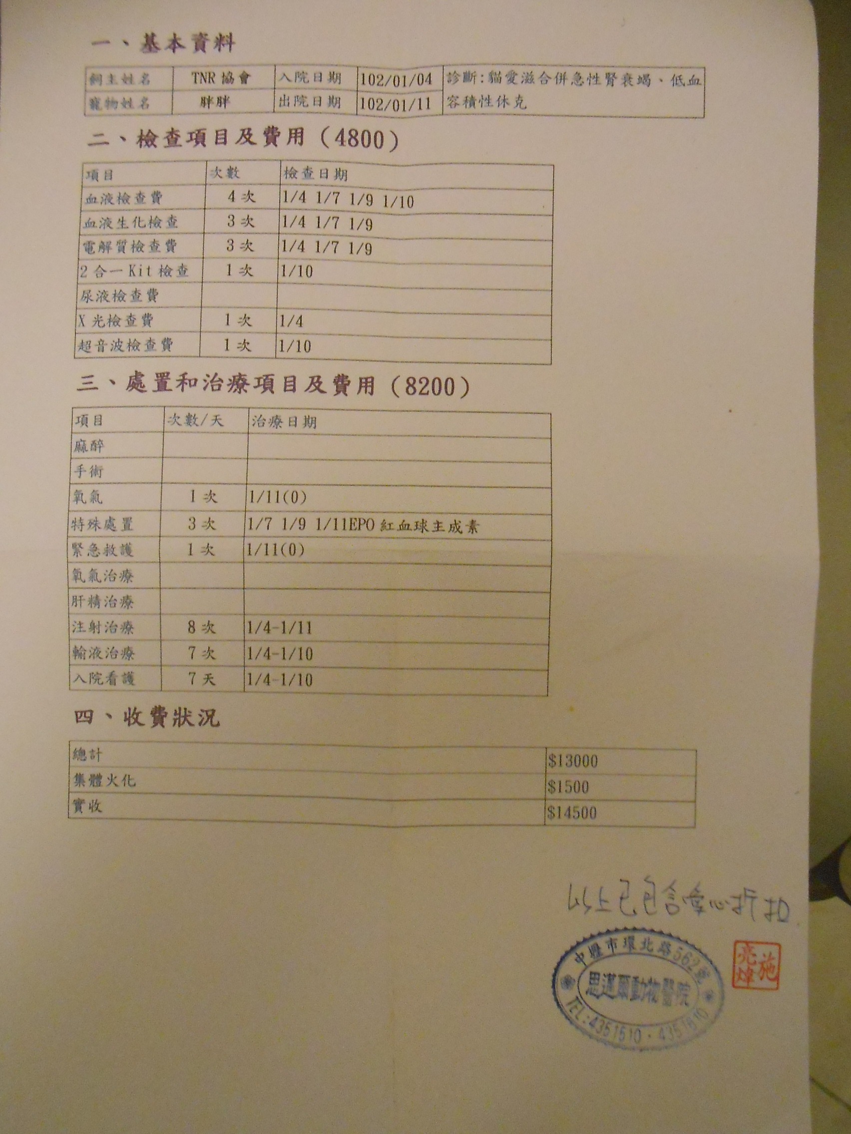 主題: 急性腎衰竭合併愛滋的胖胖 申請者姓名: 徐慕雯 花色: 申請日期: 2013-01-16 01:55:03 申請者部落格: 申請者臉書網址: http://www.facebook.com/cocohsu.1104 所在縣市/合作醫院: 桃園縣/思邁爾動物醫院 治療費用: 14500元 需求人數: 16人 已結案 (2013-06-27 14:15:05) 報名人員: 王小曼(已付款)、yitin、Jessica C. Chang、WeiLin Chen(已付款)、Hui-mi Wu(已付款)、Christina Chiang(已付款)、ArthurJo、chiasui(已付款)、Norman Wu(已付款)、Jane Liao(已付款)、Kate(已付款)、May Chuang(已付款)、Chialing Liu(已付款)、Chialing Liu(已付款)、Chialing Liu、芯荷(已付款)、沛橙李(已付款)、王大咪(已付款)、chiawei(已付款)、himawari(已付款)、 候補人員: 動物病情說明: 胖胖是我餵養很久的孩子
