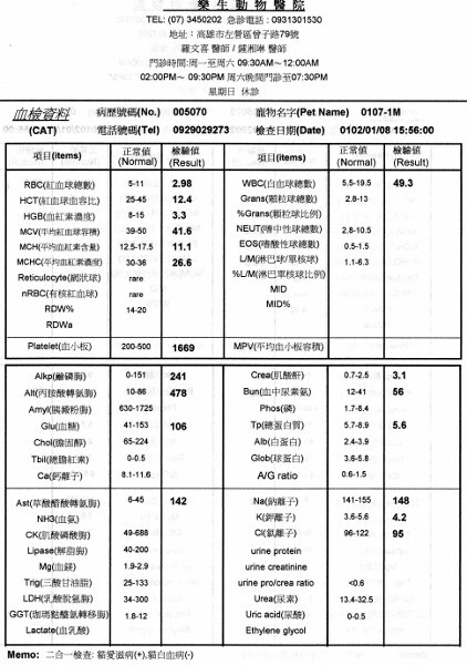 主題: 鳳林路 貧血 愛滋 黃疸又敗血的臉腫橘公貓 申請者姓名: 劉雅雲 花色: 申請日期: 2013-01-16 09:04:03 申請者部落格: 申請者臉書網址: 所在縣市/合作醫院: 高雄市/樂生動物醫院 治療費用: 5500元 需求人數: 6人 已結案 (2013-02-23 11:51:27) 報名人員: Chien Hui Hsu(已付款)、eileen11-9(已付款)、謝立立(已付款)、Ning(已付款)、philip(已付款)、Vivienne Zhao(已付款)、 候補人員: 動物病情說明: 那天行經鳳林路, 停車下來看到對面車下一隻貓咪喵喵叫, 倒了一些飼料給他吃, 他完全不怕人好像很餓的樣子走出來吃, 仔細一看臉怎麼腫成這樣, 不就醫不行, 趕緊拿出誘捕籠抓他到院檢查. 他的狀況不單只是臉腫有積膿, 醫生發現他有黃疸, 幫他驗血, 發現貧血, 白血球飆高, 有愛滋, 腎指數也高, 尿毒. 經過好幾天的搶救, 貓咪還是因為敗血走了, 不過在醫院這幾天他很溫暖的度過了最後的日子. 謝謝大家 幫忙送他最後一程.
