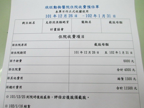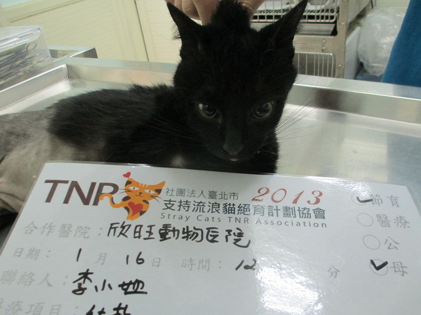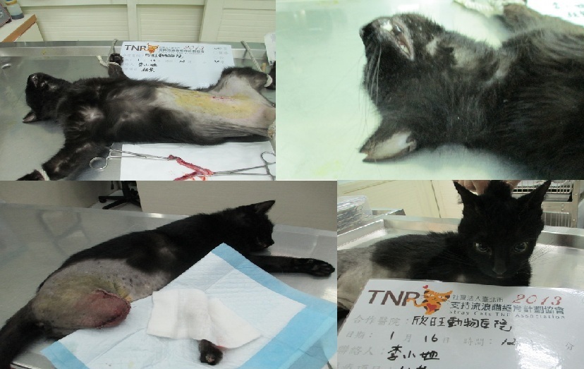 主題: 新店碧潭的小黑截肢母貓 申請者姓名: Jolynn Lee 花色: 申請日期: 2013-01-20 01:59:34 申請者部落格: 申請者臉書網址: 所在縣市/合作醫院: 台北市/欣旺動物醫院 治療費用: 11500元 需求人數: 13人 已結案 (2013-02-23 11:48:06) 報名人員: Tina Chang(已付款)、陳宏林(已付款)、Alang Tsao(已付款)、Angel Huang(已付款)、周小蕾(已付款)、小寶兔(已付款)、Ginny Cat(已付款)、Liane Tu(已付款)、Gina Chen-hui Yu(已付款)、yushi0304(已付款)、淇勻(已付款)、Hui Mei Chen(已付款)、Cindy Jai(已付款)、 候補人員: 動物病情說明: 於2012年12月25日在新店碧潭附近救援的小黑母貓,經常在我餵食的轄區對我大聲嚎叫,經觀察後發現後腿斷掌及有皮膚潰爛的現象,因此必須送醫做治療並順便結紮!經醫師評估後必須截肢一條腿以免日後小黑貓斷掌的地方會繼續磨損,非常感謝協會願意伸出援手醫助小黑貓,及各位大大的善心幫忙,小黑喵急需您的幫助,在此感謝大家!