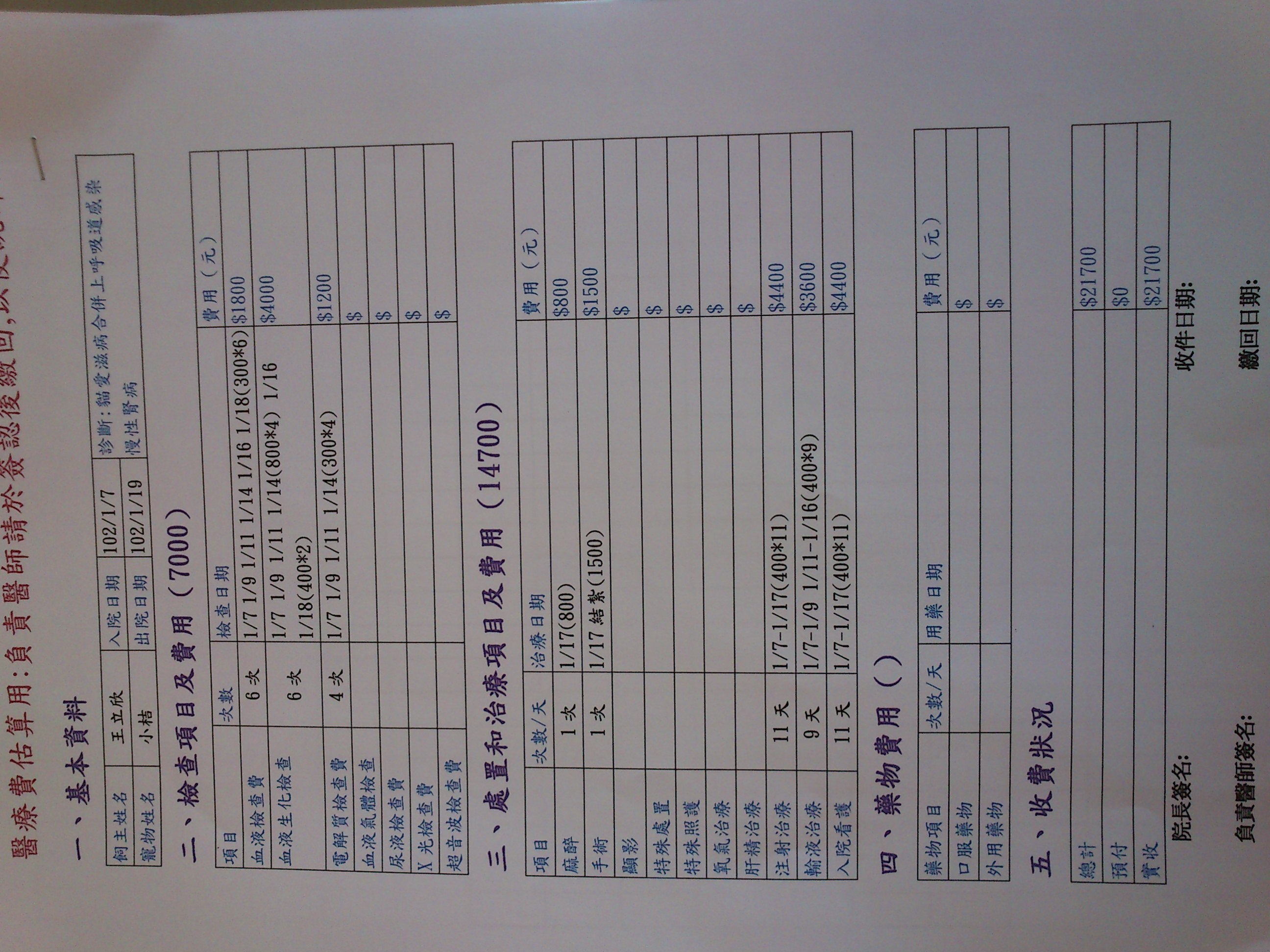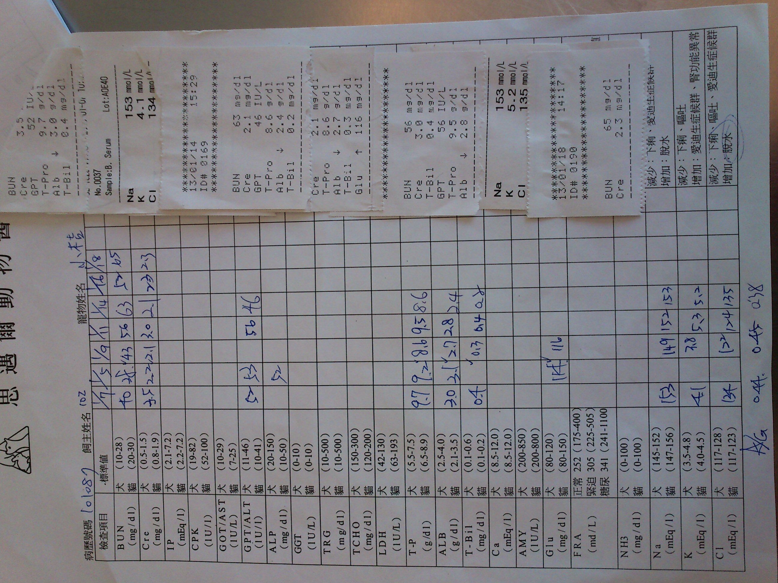 主題: 慢性腎衰竭的愛滋貓 申請者姓名: 王郁雯 花色: 申請日期: 2013-01-20 22:14:57 申請者部落格: 申請者臉書網址: 所在縣市/合作醫院: 桃園縣/思邁爾動物醫院 治療費用: 21700元 需求人數: 23人 已結案 (2013-06-27 14:27:57) 報名人員: Cat Black(已付款)、Jessica C. Chang(已付款)、Eugene(已付款)、Ivy Hsu(已付款)、Lo Chun Hung(已付款)、Daphne Lin、Diana Yang(已付款)、cenry(已付款)、lunyi(已付款)、PeiChi Huang(已付款)、Nadia(已付款)、Stefania(已付款)、Wei Lin(已付款)、valen(已付款)、Joyce Shih(已付款)、Ying Tung Chen(已付款)、PeiChi Huang(已付款)、Ping Meng(已付款)、王踢娜(已付款)、春卷(已付款)、阿貓(已付款)、Mia Wei(已付款)、hakumaio(已付款)、林雅雯(已付款)、 候補人員: 動物病情說明: 在桃園龍潭鄉某釣蝦場流浪討生活的橘白公貓,不敵寒流感冒,上呼吸道感染嚴重無法呼吸而張口呼吸,緊急送醫,檢查出牙周病嚴重,牙齒沒幾顆,,嚴重脫水,貧血,慢性腎衰竭,第三眼瞼破裂,白血球飆至四萬,驗出貓愛滋。治療過後,紅白血球在正常值,體內水分正常,必須終身吃腎處方飼料,每天需打皮下點滴補充水分,已出院帶回照顧。
