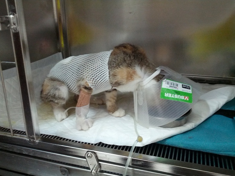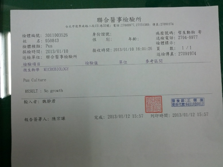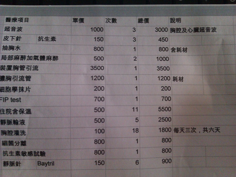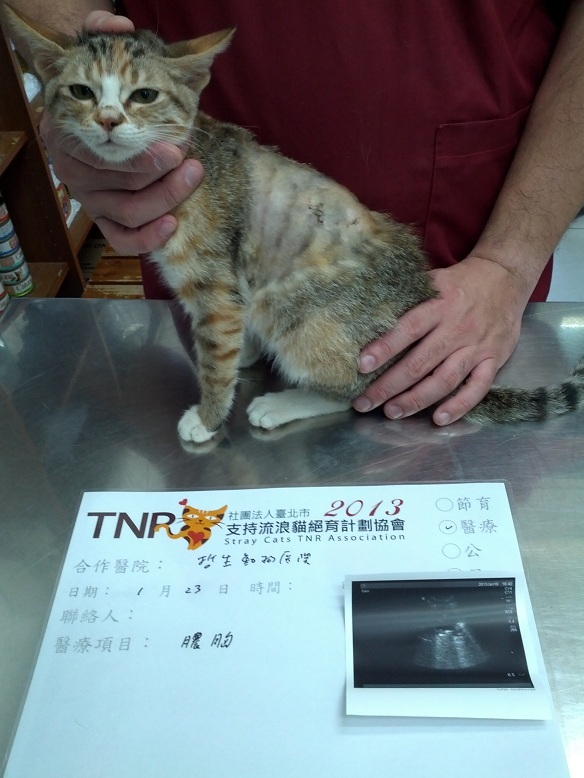 主題: 從鬼門關"搶"回來的路倒膿胸小三花 申請者姓名: 黃意如 花色: 申請日期: 2013-01-25 11:20:41 申請者部落格: 申請者臉書網址: 所在縣市/合作醫院: 新北市/哲生動物醫院 治療費用: 18520元 需求人數: 20人 已結案 (2013-07-01 18:16:58) 報名人員: vuvuzera(已付款)、Kristy Lee(已付款)、Mei-Yi Wu(已付款)、Eva Yu、Fiona Ling(已付款)、Fiona Ling、Yi Chi Tsai(已付款)、JoyMonkey(已付款)、Eva Yu、Molly Lin(已付款)、judy(已付款)、Kelly(已付款)、Amy(已付款)、不不熊(已付款)、Eva Yu、Zoe Chen(已付款)、DC(已付款)、Eva Yu、Eva Yu(已付款)、土豆湯圓(已付款)、11(已付款)、ミルク ミルク(已付款)、Mandy Wang(已付款)、小可(已付款)、李碧(已付款)、 候補人員: 動物病情說明: 寒冷的冬天早晨,在淡水竹圍區停車場的車道邊,發現一隻小三花一動也不動躺著,下車察覺還有喘息,緊急送醫。醫生檢查並無明顯外傷,但呼吸很慢且體溫過低,照完超音波,還發現胸部有大量液體,緊急抽出100多c.c的淡黃色液體。不明原因造成嚴重的膿胸,並將檢體送化驗,同時進行"胸管引流手術"。住院期間每天引流出不少的膿液,但小貓咪求生意識強烈,漸漸的就自己進食。拔除胸管後,為了節省住院費由志工接回照顧。同時醫院因浪貓給予8折優惠價。
