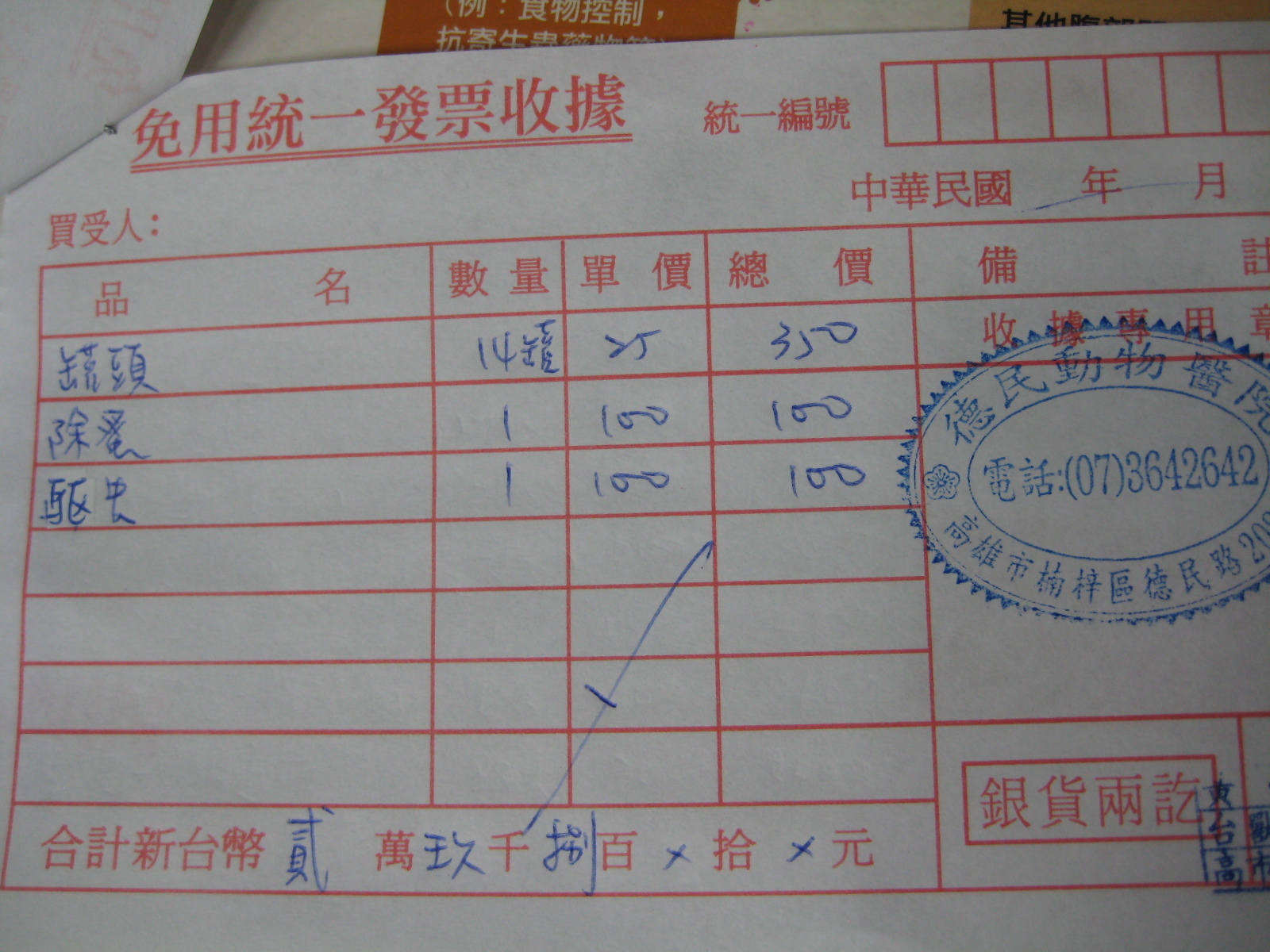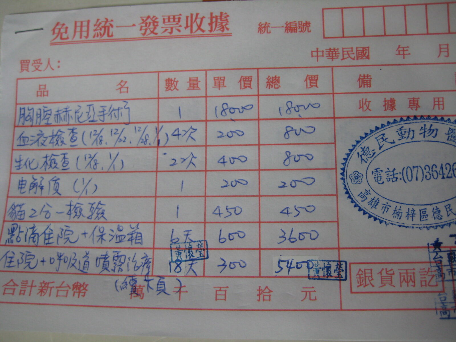 2012/12/16 小浪貓似乎還是不吃不喝,精神上看起來好像不是很好,頻頻打瞌睡又卻不肯趴下來睡,我的手一放到牠的下巴拖著,牠竟然就這樣睡了?!看著牠不吵也不鬧,安靜地坐在我身邊看著我,似乎要我幫幫牠,最後忍不住只好違背爸媽的意思,我帶牠去就近的動物醫院檢查,醫生告訴我牠沒有明顯的外傷或骨折,但是橫膈膜破裂導致腸子往上跑入胸腔中,才會如此呼吸急促!問了醫生需要手術的費用跟成功率,這龐大的價錢讓我卻步了....可是又基於心疼小浪貓,只好請醫生幫牠打止血.消炎.止痛這三針,花了600元...