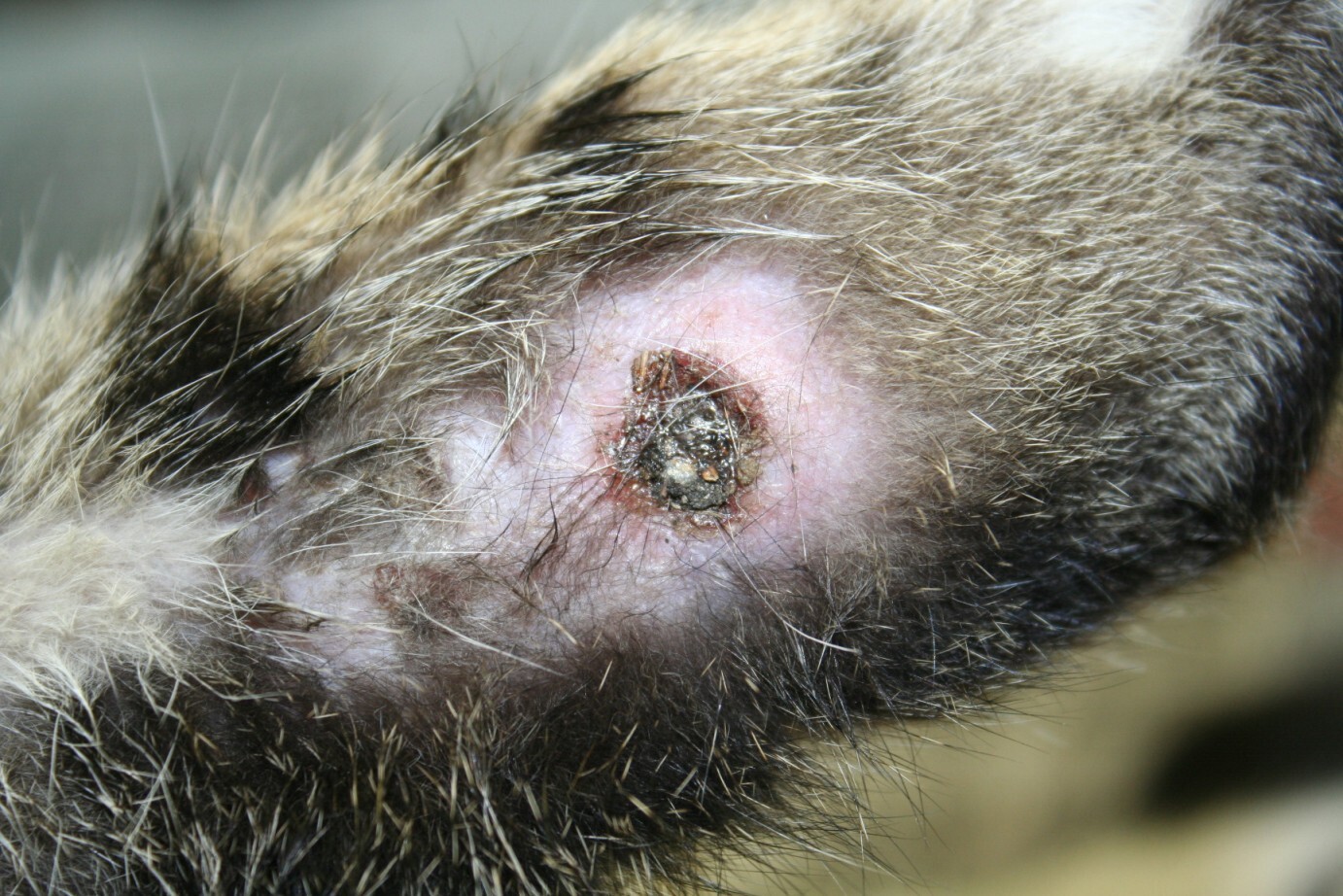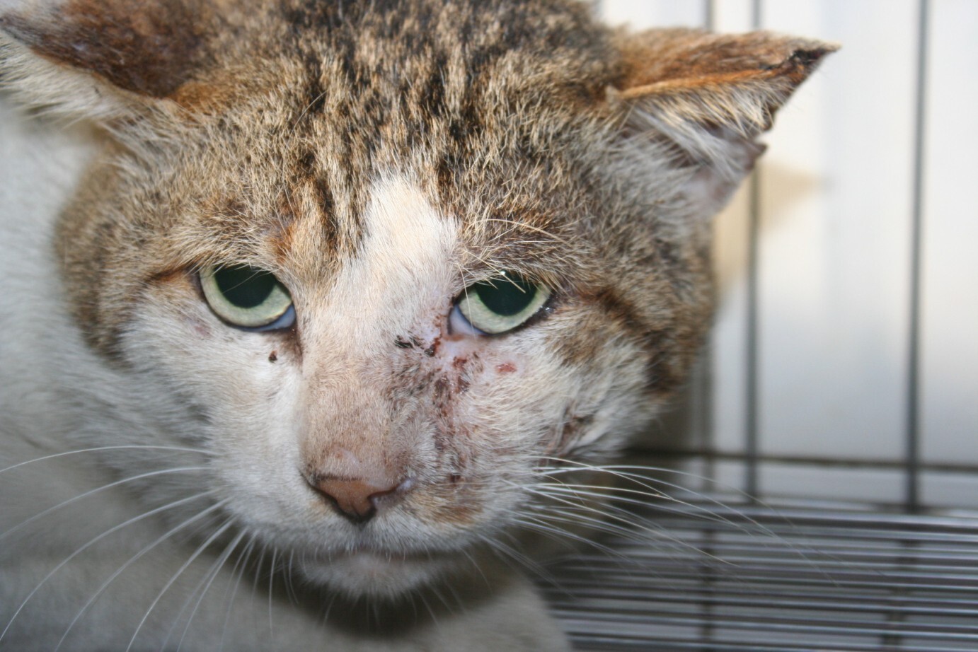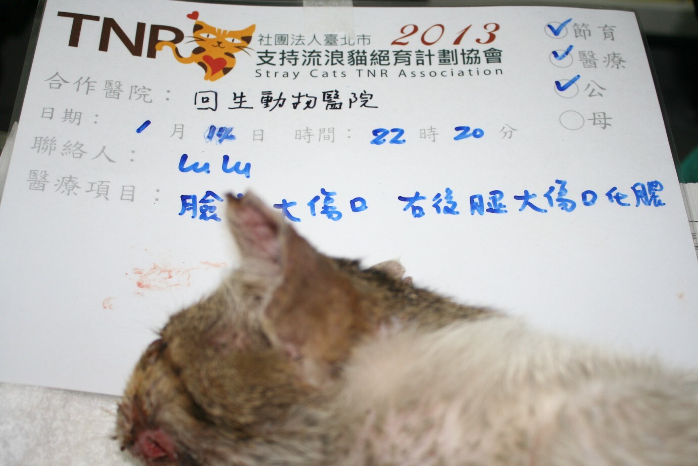 經吳醫師檢查後發現,貓咪臉部左側有一大範圍化膿腫脹傷口,有可能是異物造成的傷害,右後小腿也有一大傷口,已化膿及腫脹,須住院治療,期間也進行節育。