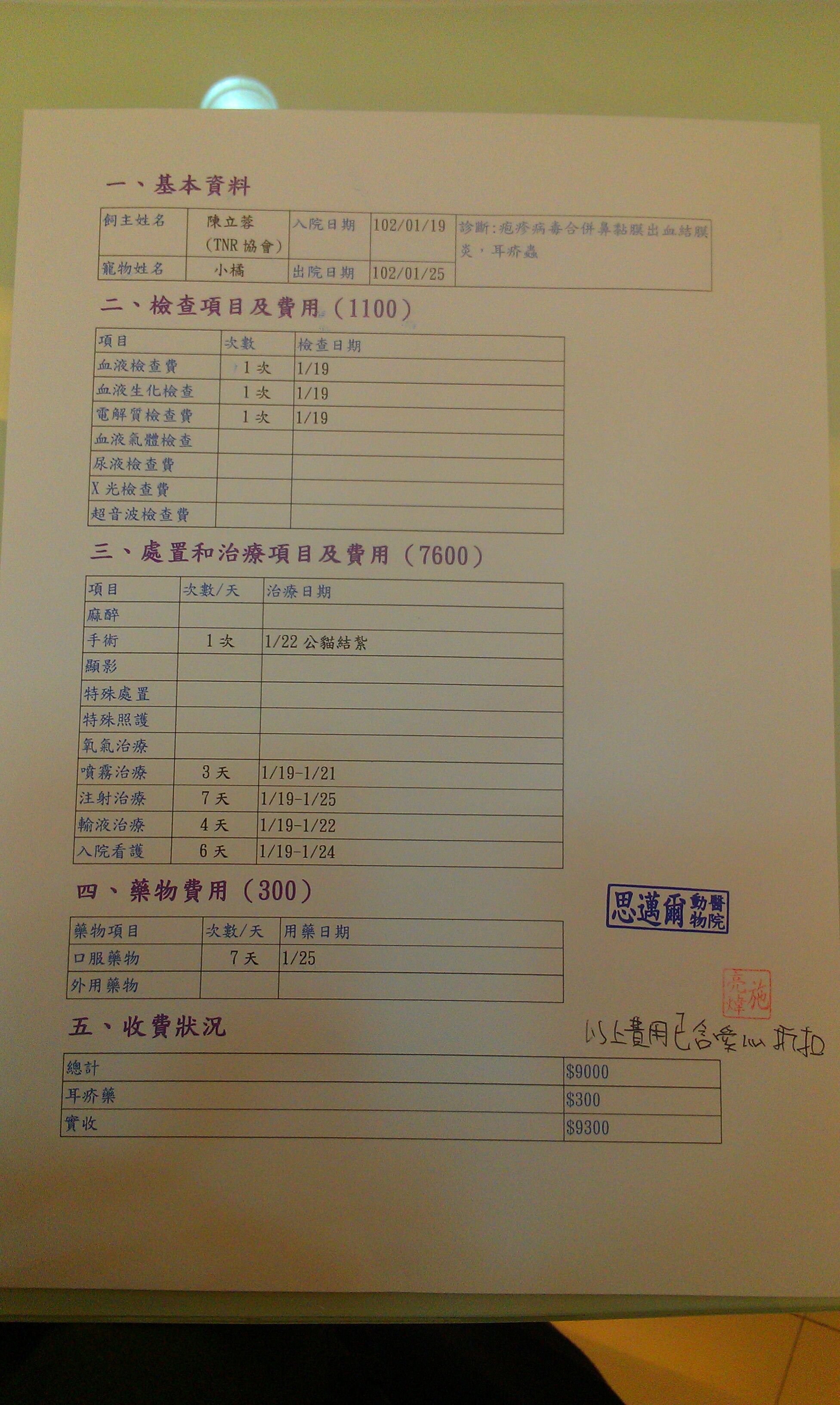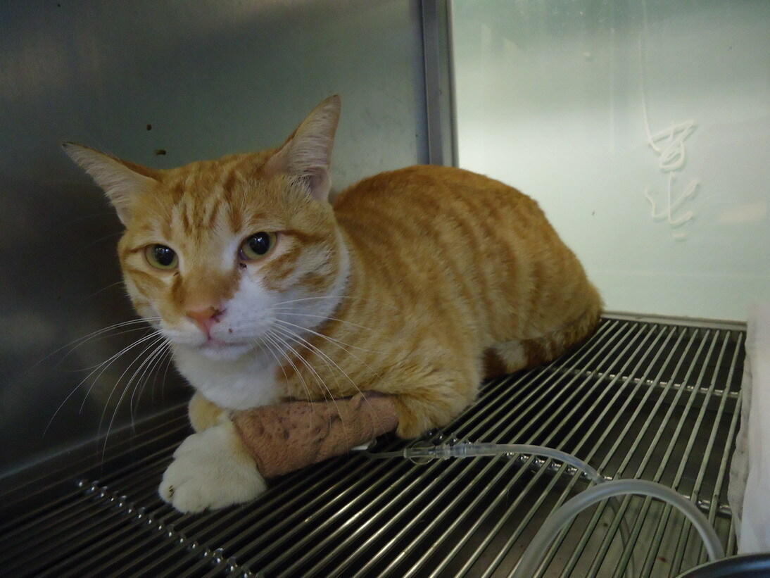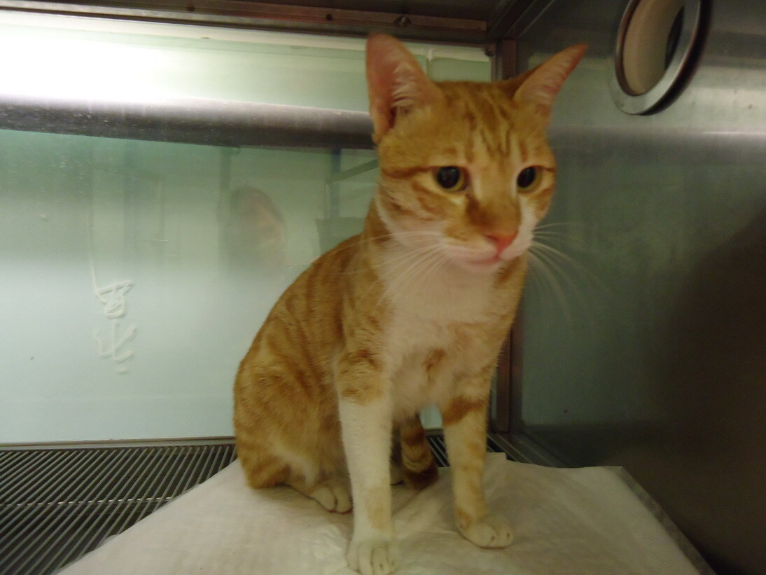 檢查出是感染疱疹病毒合併鼻黏膜出血結膜炎,醫生說牠已經嚴重到鼻子呼吸都會擤出血了,也有嚴重的耳疥蟲,經由治療照顧一週後小橘狀況已穩定了,也做了結紮手術,目前已出院,現在交由中途媽媽細心照顧,感謝協會的幫忙,小橘的醫療費還請大家多多幫忙..謝謝大家