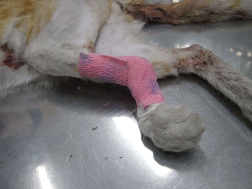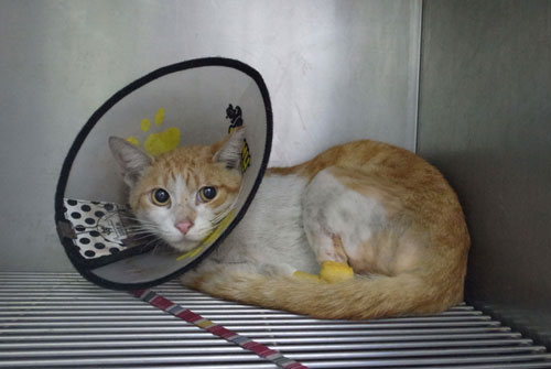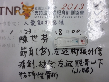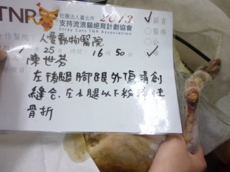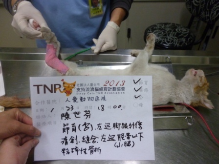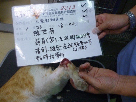 主題: 車禍跛腳貓傷口清創 申請者姓名: 陳世芬 花色: 申請日期: 2013-01-29 04:11:53 申請者部落格: http://tw.myblog.yahoo.com/ni-blackcat 申請者臉書網址: http://www.facebook.com/fandy.chen 所在縣市/合作醫院: 高雄市/人愛動物醫院 治療費用: 4140元 需求人數: 9人 已結案 (2013-08-06 13:52:56) 報名人員: noahshoes(已付款)、Fandy(已付款)、蔡明亨(已付款)、Cathy Chang(已付款)、周菁(已付款)、Vivian Lee、Ping Meng(已付款)、Fion(已付款)、Ryuko Chuang(已付款)、Shirley Tsai(已付款)、 候補人員: 動物病情說明: 這隻橘白貓是在我附近出現的新貓,大概1月初出現,開始餵養,預計誘捕結紮。最近看到牠走路跛腳,1/23誘捕,貓咪還能從屋頂上跳下,左後腳有傷仍在流血,抓到時誘捕籠和報紙血跡斑斑很可憐,醫生說可能是車禍撞傷,為了保全貓咪日後生活能力,沒有截肢可保命,貓咪左後腳前段有骨頭粉碎,腳掌仍有神經反應可行動,1/26已轉院。