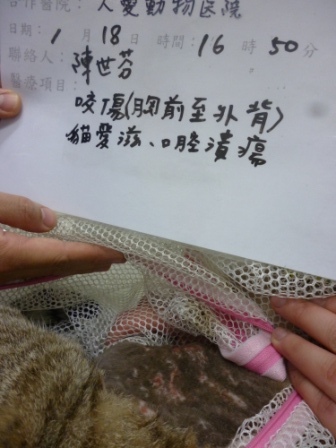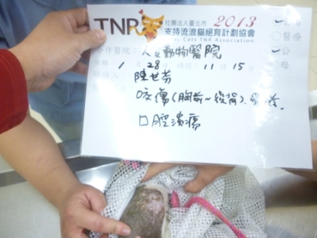 醫生說傷口外觀不尋常,疑似被虐,像用鐵絲磨破胸部,也有可能是互咬或摩擦到地面。驗血看感染程度,發現此貓有愛滋,有口腔潰爛。換藥剛開始會緊張,幾天後好像知道醫護人員在救牠,沒有特別掙扎乖乖配合,傷口面積較大相對癒合時間就長,在大家努力下傷口終於結痂,已康復出院放回原地。