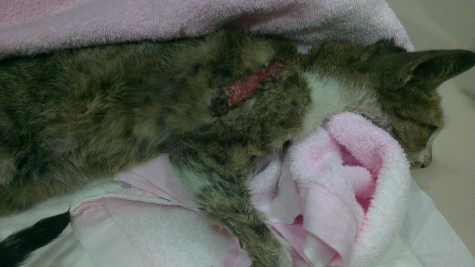 唔......今天在公司(南港路三段47巷與昆陽街60巷那一帶)附近看到一隻流浪貓,疑似被車撞到(身體有嚴重凹陷、前腳脫臼)加上脖子看起來有橡皮筋纏繞......已經皮開肉綻,消防局有來幫忙,但他防心太重,且還可以跑動一直躲在車子底下,無法幫助牠的消防局建議我們找誘捕的單位...Orz但動保協會說他們沒有要申請不知道該怎麼辦QQ