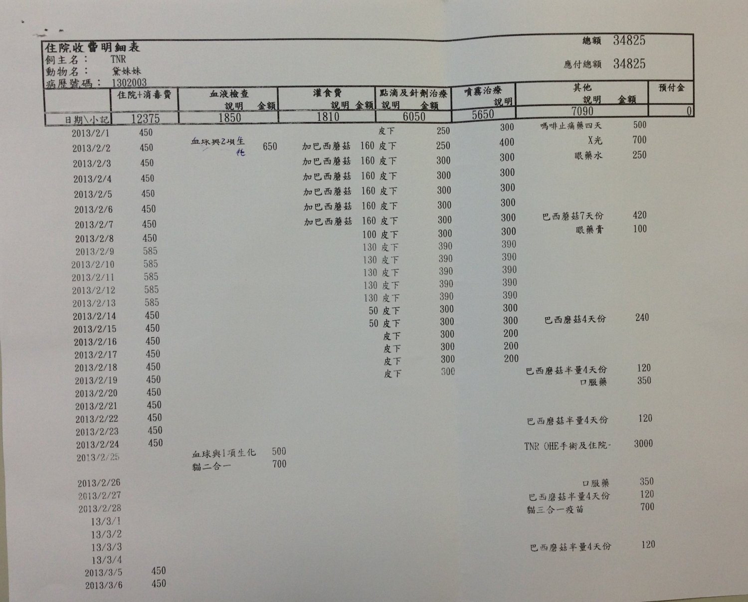 主題: 收容所帶出救援的嚴重鼻氣管炎病貓 申請者姓名: Akimasa Tu 花色: 申請日期: 2013-03-11 11:43:45 申請者部落格: 申請者臉書網址: https://www.facebook.com/akimasa.tu 所在縣市/合作醫院: 台北市/長青動物醫院 治療費用: 34825元 需求人數: 36人 已結案 (2013-06-27 14:21:36) 報名人員: Barret Chi(已付款)、Eliza Chen(已付款)、陳小茜(已付款)、翅膀(已付款)、蕭秀秀(已付款)、韋安(已付款)、簡蜜歐(已付款)、Anita Cheng(已付款)、紅色柚子(已付款)、李水晶(已付款)、Mary Chung(已付款)、Rita Huang(已付款)、阿嘉(已付款)、Kit Mimicat(已付款)、WeiLin Chen x2(已付款)、劉大渝(已付款)、Maureen Huang(已付款)、Percy Wu(已付款)、楊敏、楊敏、Melody Wu(已付款)、Weirong(已付款)、Huiying Ke(已付款)、Choco Chen(已付款)、Betty Ou(已付款)、Ping Meng(已付款)、Alumi Lu(已付款)、楊小馥(已付款)、潘逸群(已付款)、林嘉南(已付款)、戴戴(已付款)、波波(已付款)、Zoe Chen(已付款)、umimi x2(已付款)、Sunny Chen x2(已付款)、 候補人員: 動物病情說明: 過年前被收容所,安排在優先安樂名單的黛妺妺,患了嚴重鼻氣管炎,協會將他接出治療,經過醫院細心的治療,漸漸恢復健康,住院期間也幫他結紮,目前黛妺妺已恢復健康,且非常的親人,出院至協會安置中心暫置,等待愛心人士的認養。
