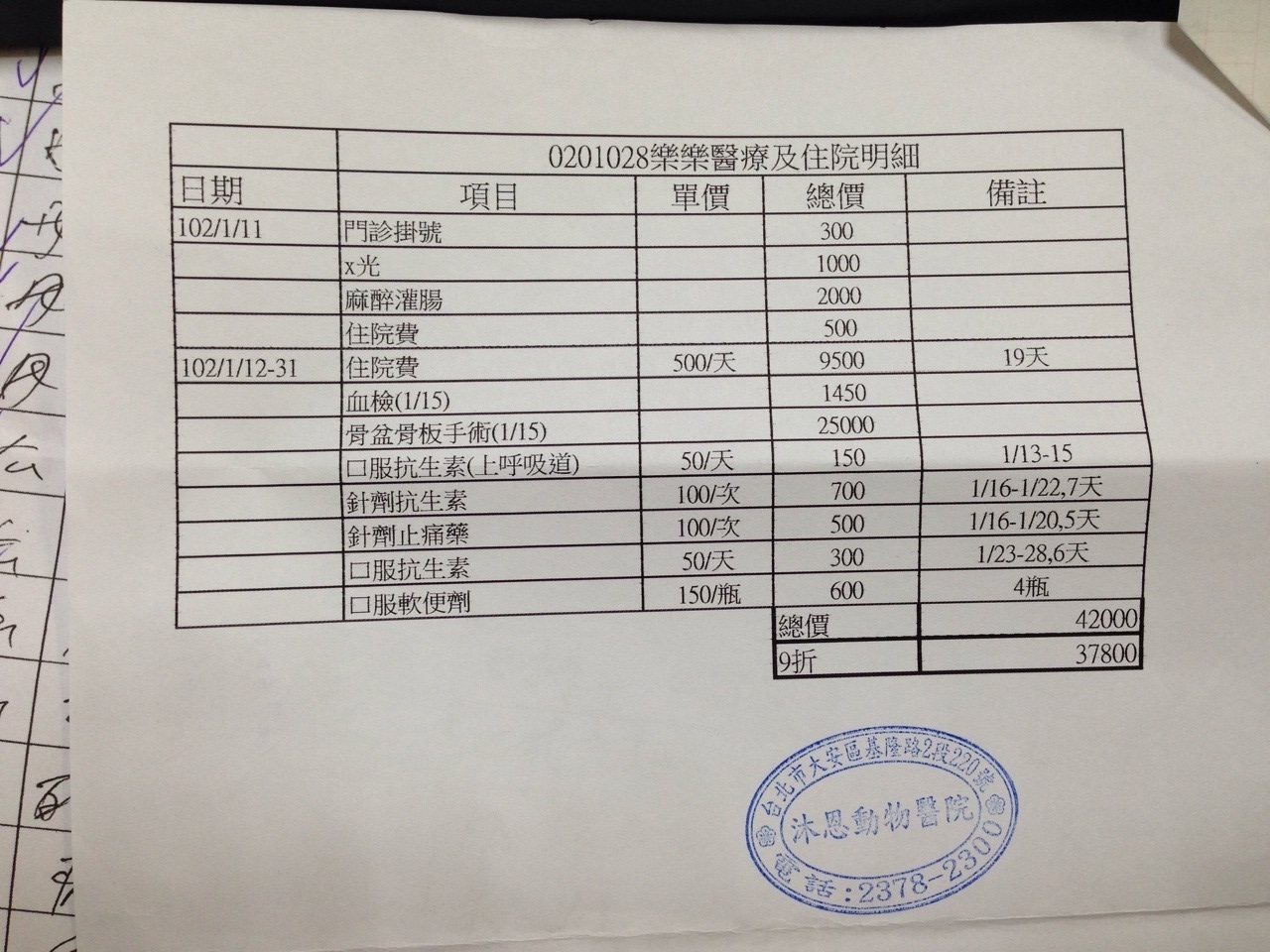 主題: 第二波醫助~士東國小前被車撞的樂樂 申請者姓名: 楊凱蒂 花色: 申請日期: 2013-02-10 21:59:26 申請者部落格: 申請者臉書網址: https://www.facebook.com/#!/katieyangdayounger1 所在縣市/合作醫院: 台北市/其他院所醫助專案(醫院請先MAIL溝通) 治療費用: 37800元 需求人數: 39人 已結案 (2013-06-27 14:20:53) 報名人員: 吳小菲、吳小菲(已付款)、凌波煙嵐(已付款)、凌波煙嵐(已付款)、凌波煙嵐(已付款)、凌波煙嵐(已付款)、Erica Chen、Lee Ban Ban(已付款)、愛喵garnet(已付款)、愛妖(已付款)、SweetTpg(已付款)、Zoe Chen(已付款)、臉長(已付款)、林嘉南(已付款)、小王(已付款)、Jessica Lin(已付款)、boudi(已付款)、Katalina Chang(已付款)、Huimin Liu(已付款)、Joyce Chung(已付款)、林思思(已付款)、hide(已付款)、Eason(已付款)、Hui Mei Chen(已付款)、梁咪子(已付款)、梁咪子(已付款)、meemee(已付款)、papa(已付款)、julie lee(已付款)、yenyen(已付款)、真子(已付款)、林微利(已付款)、陳湘淇(已付款)、Sky Lin(已付款)、Stephen(已付款)、chanru(已付款)、張如佩(已付款)、小宣(已付款)、煎塔媽(已付款)、Rain Love(已付款)、Katie Yang(已付款)、 候補人員: 動物病情說明: 樂樂在12/28時結束第一波醫療. 由協會先接回貓屋照顧. 但在1/11 號樂樂因為沒有排便外加精神不濟食慾不佳, 再次進醫院檢查治療. 經過評估, 醫生決定幫樂樂做骨盆腔重建手術. 動物近況說明: 樂樂目前可以站起活動, 但因為未來復健之路還要半年到一年. 為了省費用, 決定再次回協會照顧. 等候年後有中途者出現接收樂樂.
