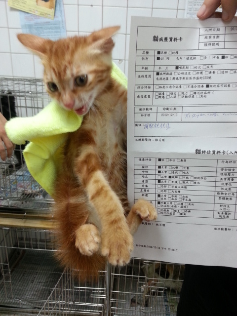 主題: 板橋收容所帶出不吃不喝小貓 申請者姓名: 臺北市支持流浪貓絕育計劃協會 花色: 申請日期: 2013-02-13 00:15:18 申請者部落格: 申請者臉書網址: 所在縣市/合作醫院: 台北市/其他院所醫助專案(醫院請先MAIL溝通) 治療費用: 1000元 需求人數: 16人 已結案 (2013-04-12 11:09:23) 報名人員: 林微利(已付款)、yymeow(已付款)、Sunny Chen(已付款)、Chenyu Chang(已付款)、茹執事(已付款)、Sky Lin(已付款)、Jason Chang(已付款)、煎塔媽(已付款)、焦糖卡布米(已付款)、Baga Lan(已付款)、Dora陳(已付款)、Rain Love(已付款)、Maxine Chen(已付款)、Lucida Chen(已付款)、JillHuang(已付款)、呆呆(已付款)、 候補人員: 動物病情說明: 這是協會志工去板橋收容所時