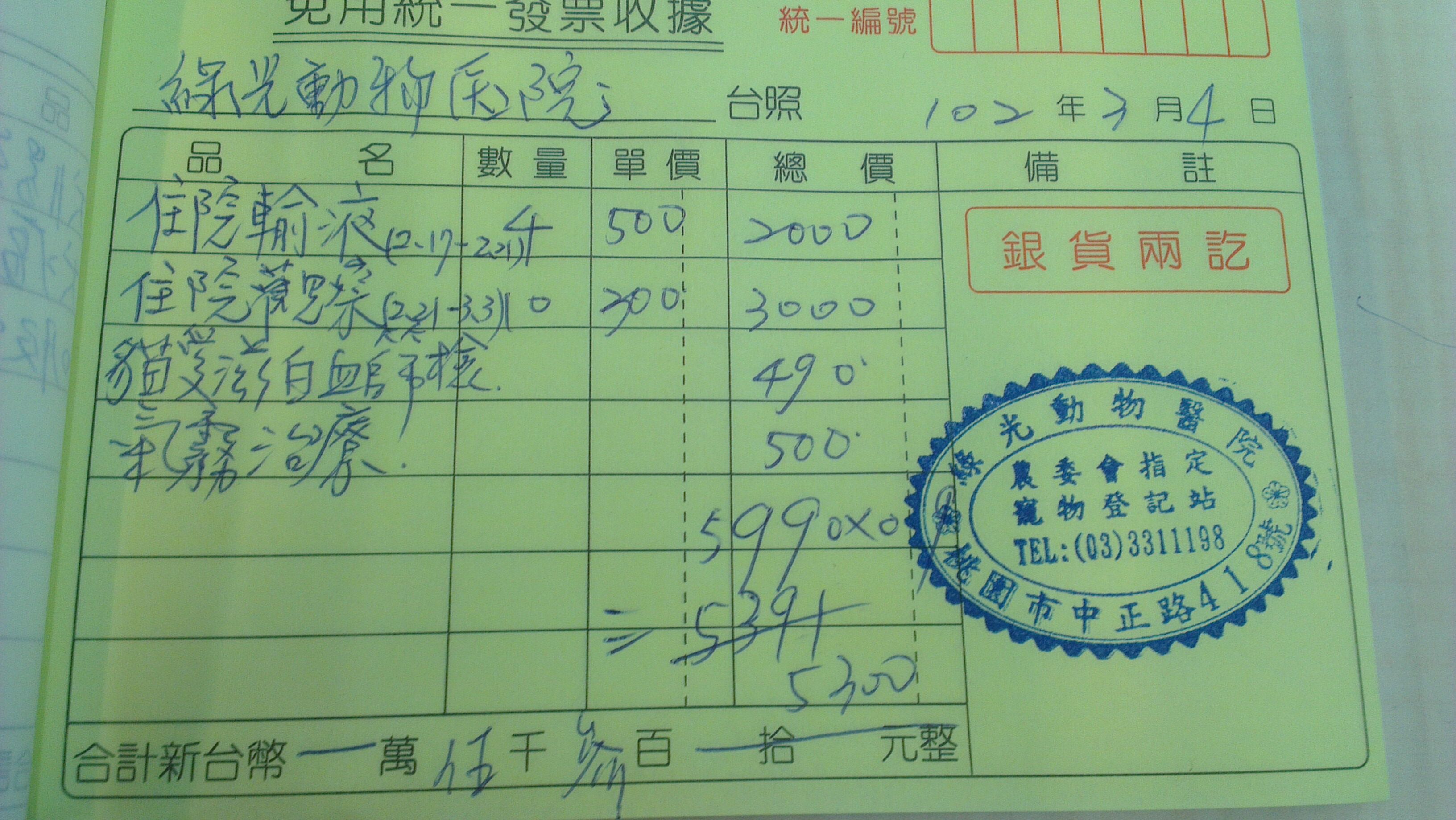 主題: 嚴重上呼吸道感染 虛弱路倒的小孩~小乖 申請者姓名: monica chang 花色: 申請日期: 2013-03-08 14:36:01 申請者部落格: 申請者臉書網址: 所在縣市/合作醫院: 桃園縣/綠光動物醫院 治療費用: 5300元 需求人數: 12人 已結案 (2013-04-12 11:07:37) 報名人員: Orak Yeh(已付款)、Cathy25 x2(已付款)、波波(已付款)、philip(已付款)、甘茴香(已付款)、藍波(已付款)、阿蓋 (已付款)、Sean M. Wu(已付款)、Tiffany Shen(已付款)、Joba Huang x2(已付款)、 候補人員: 動物病情說明: 102/02/17