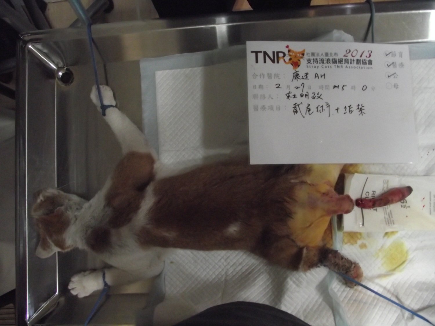 主題: 長安國小邊爛尾橘白貓救援 申請者姓名: Akimasa Tu 花色: 申請日期: 2013-03-21 01:35:18 申請者部落格: 申請者臉書網址: https://www.facebook.com/akimasa.tu 所在縣市/合作醫院: 台北市/康廷動物醫院 治療費用: 6400元 需求人數: 7人 已結案 (2013-04-12 11:06:43) 報名人員: Kiki Liang(已付款)、仲希妍(已付款)、Candice Chao(已付款)、Amelie Shen(已付款)、毛毛(已付款)、Monica Wang(已付款)、Chen Ping(已付款)、 候補人員: 動物病情說明: 經由協會網頁的訊息接獲的通報,於松江路某巷公園,有一爛尾貓,整隻尾巴紅通通,流血不止,當天晚上前去查看,順利誘捕,送至康廷進行截尾手術,並做結紮,另一親人的三腳三花貓,送到醫院檢查,為已結紮的母貓,但未剪耳,一並申請費用。