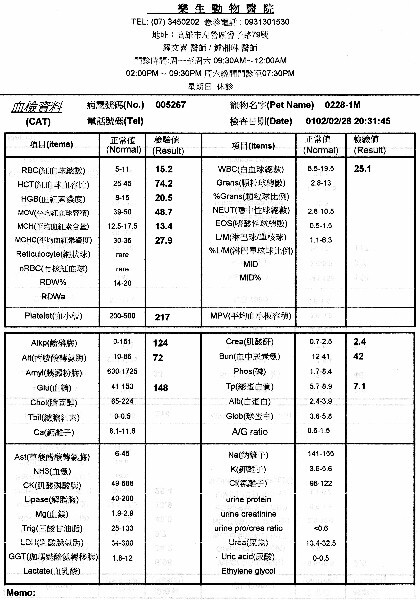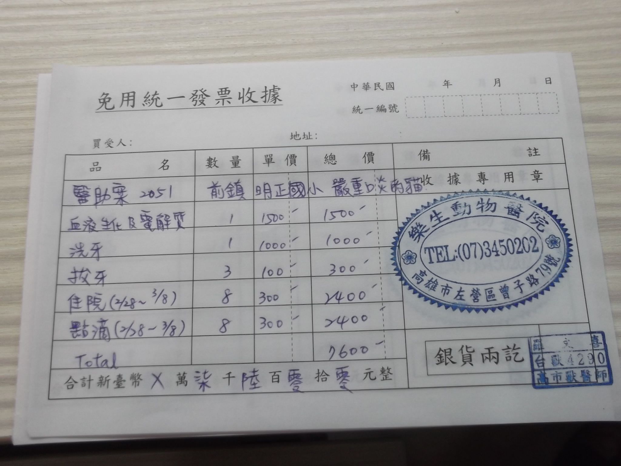 主題: 前鎮 明正國小附近 疑似嚴重口炎的貓 申請者姓名: 劉雅雲 花色: 申請日期: 2013-03-17 13:53:05 申請者部落格: 申請者臉書網址: 所在縣市/合作醫院: 高雄市/樂生動物醫院 治療費用: 7600元 需求人數: 17人 已結案 (2013-04-12 11:06:21) 報名人員: Kiki Liang(已付款)、小美綸(已付款)、Betty Chiang(已付款)、邱小咪 x2(已付款)、Freessia Lin(已付款)、Mia Chang(已付款)、小牛(已付款)、Chen Shih-fan x2(已付款)、夢東橋(已付款)、Sally x2(已付款)、nina(已付款)、錢曼尼(已付款)、Koyuki Lui(已付款)、joanna(已付款)、 候補人員: 動物病情說明: 這是小港明正國小餵食區已紮過的浪貓, 觀察多天貓咪不太願意進食, 下巴有口水並紅紅的, 疑似嚴重口炎, 已先送到合作醫院 樂生動物醫院請醫生檢查與治療.