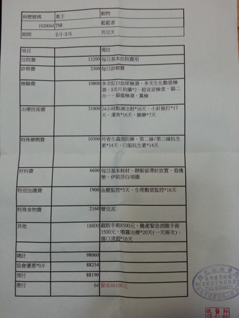 主題: 從死神手中搶回的藍藍香 申請者姓名: 臺北市支持流浪貓絕育計劃協會 花色: 申請日期: 2013-03-06 22:49:44 申請者部落格: 申請者臉書網址: 所在縣市/合作醫院: 台北市/其他院所醫助專案(醫院請先MAIL溝通) 治療費用: 88190元 需求人數: 90人 已結案 (2013-06-27 14:26:40) 報名人員: sam(已付款)、呂杰達(已付款)、Monica Hu(已付款)、Kelly Chen(已付款)、海苔(已付款)、姚怪賢(已付款)、Lucida Chen(已付款)、Lewis Wong(已付款)、Peggy Shih(已付款)、April Tsung(已付款)、Sandy Lee(已付款)、Hui Mei Chen(已付款)、泰迪貓(已付款)、Irene Yen(已付款)、邱姵慈(已付款)、YaYa Chen(已付款)、YaYa Chen(已付款)、Lee Mei Lee(已付款)、黃小酷(已付款)、野玫瑰(已付款)、謝立立(已付款)、Mimi Lin(已付款)、牧貓人 x2(已付款)、Shih Ju Chiu(已付款)、陳旺旺(已付款)、Phoebe(已付款)、四面佛大梵天王(已付款)、Jong Chia Liu x2(已付款)、四面佛大梵天王(已付款)、Min-Hua LI(已付款)、Alisha Hsieh x2(已付款)、郭小喵(已付款)、Gina(已付款)、李庭芝(已付款)、virginia(已付款)、Jia Wang(已付款)、安里(已付款)、Panta Chiu(已付款)、Cathy25(已付款)、Cathy25 x2(已付款)、白啵啵(已付款)、曾家動物寶貝 x2(已付款)、Carol Yu(已付款)、Carol Yu(已付款)、Wendy Wang(已付款)、顏美慧 x3(已付款)、Walami Lin(已付款)、貓公會淡水海貓分部 x4(已付款)、ちん やめん(已付款)、Charo Lee(已付款)、艾倩(已付款)、阿貓(已付款)、Becca Huang(已付款)、ponton(已付款)、王道凱(已付款)、Fong Chi-Bin(已付款)、玲子 x2(已付款)、Alumi Lu(已付款)、Sunny Chen(已付款)、valen(已付款)、益山(已付款)、Benita Yeh(已付款)、Kyra Chu(已付款)、Ming-Yu Yang(已付款)、Jane Liao(已付款)、miraai(已付款)、Grace Lin(已付款)、Donna Lee x2(已付款)、Vivienne Peng(已付款)、橘橘貓(已付款)、Nora Chu(已付款)、Jillfly(已付款)、Bear Huang x6(已付款)、 候補人員: Howard Hwang、Claus、Mark Chao、 動物病情說明: 她,是被排在年前第一批安樂名單中的貓咪,