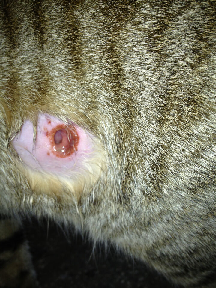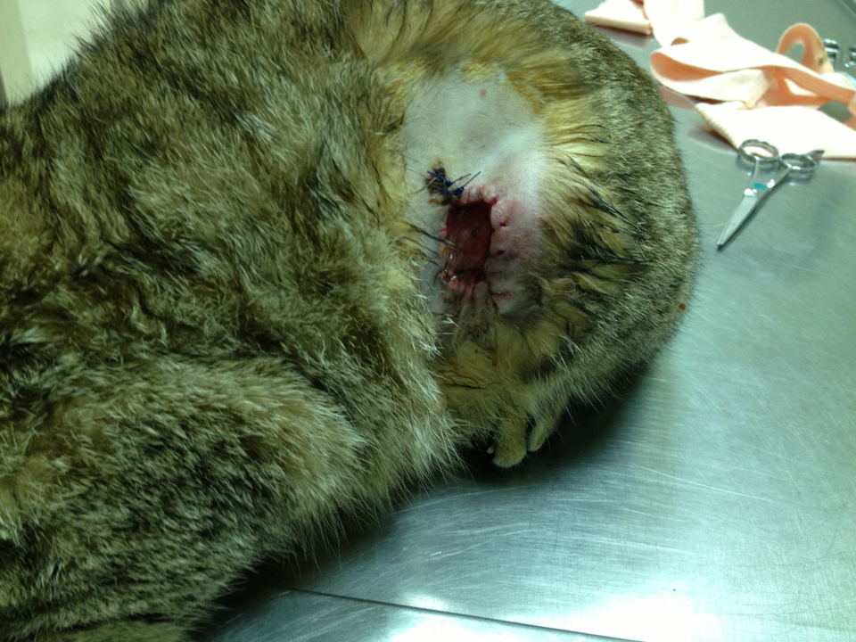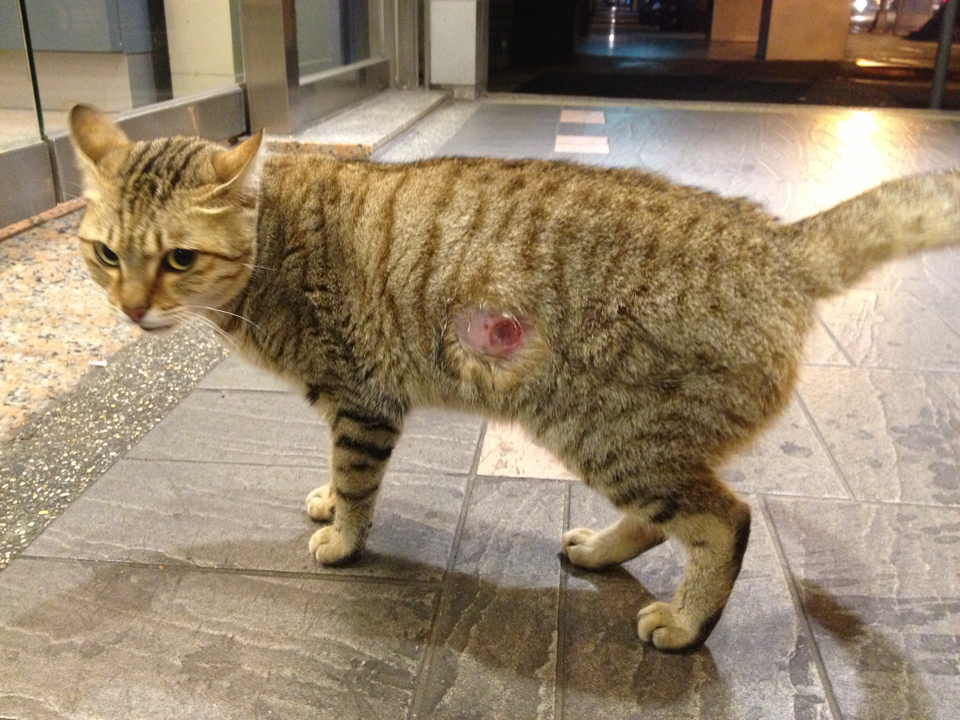 誘捕成功後,我立即將咪咪送到附近當時唯一開始營業的天母楊動物醫院;但是在兩星期的住院和兩次的清創修補手術後,狀況不但沒好轉,甚至傷口從5元硬幣裂開變成50元硬幣大小;我很擔心咪咪繼續待下去會活不成,所以決定3/1上午趕緊幫咪咪轉到設備較好的長青動物醫院。