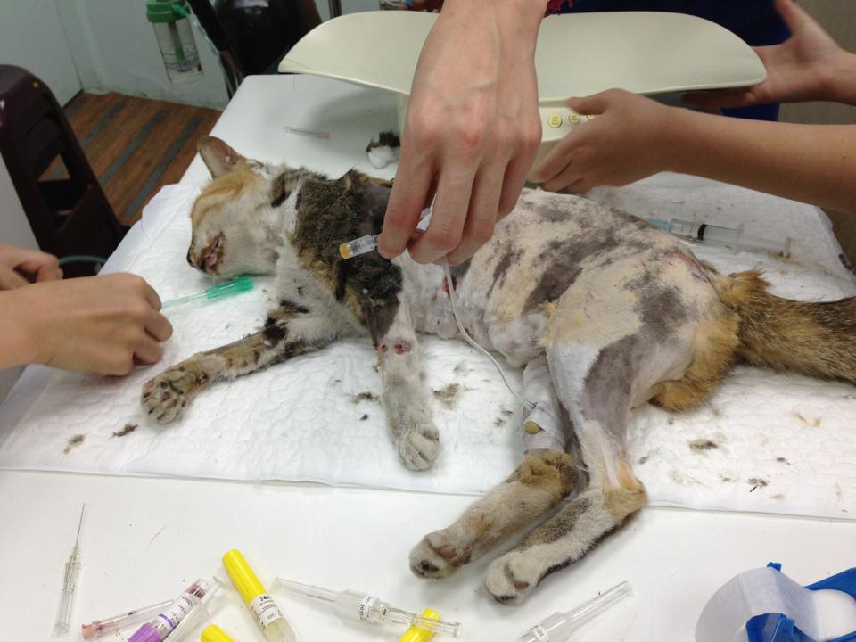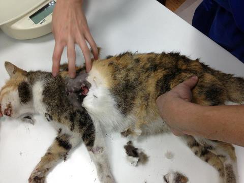 主題: 北投關渡郵局被群狗攻擊的三花貓 申請者姓名: 臺北市支持流浪貓絕育計劃協會 花色: 申請日期: 2013-03-08 11:47:03 申請者部落格: 申請者臉書網址: 所在縣市/合作醫院: 台北市/其他院所醫助專案(醫院請先MAIL溝通) 治療費用: 7025元 需求人數: 8人 已結案 (2013-06-27 14:26:26) 報名人員: 錢曼尼(已付款)、Mai Lin Lai(已付款)、周振禮(已付款)、周振禮、小娃(已付款)、何春生(已付款)、鄭小鄭(已付款)、Js Lee(已付款)、Sunny Chen(已付款)、 候補人員: 動物病情說明: 接到民眾來電,北投關渡郵局有一隻貓咪被狗攻擊躲進車下,因為貓咪會怕人又加上車子的底盤很低無法順利將貓咪救出,協會接到通知第一時間請附近志工小雅過去查看支援,志工Akimasa用網子捕抓送醫,貓咪到院時,體溫只剩下33.6度,肩胛骨斷裂、氣胸,全身多處咬傷,疑似有傷到頸椎神經,隨時有可能會休克,因為血壓很低無法順利上點滴,經過搶救仍在晚間當小天使,醫療費用還請各位幫忙。--謝謝!