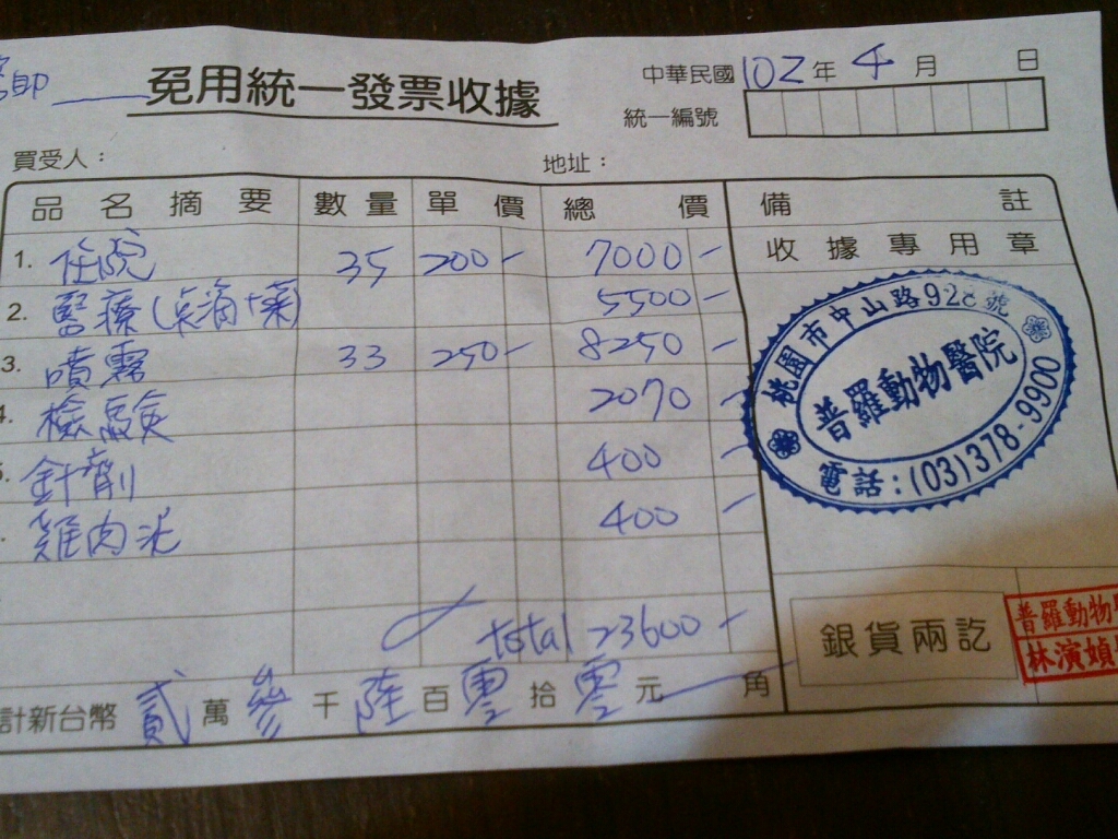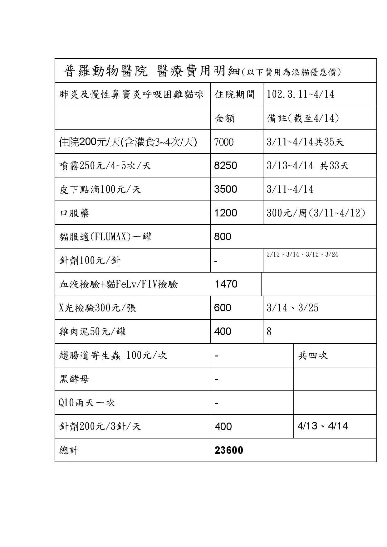 主題: 已不願意進食 申請者姓名: 黃愛羚 花色: 申請日期: 2013-04-19 20:33:24 申請者部落格: 申請者臉書網址: 所在縣市/合作醫院: 桃園縣/普羅動物醫院 治療費用: 23600元 需求人數: 48人 已結案 (2013-06-27 14:26:06) 報名人員: imlosting(已付款)、瞳桓 x2(已付款)、Shulin Hsieh x2(已付款)、pheles(已付款)、郭繪於(已付款)、維尼(已付款)、Satsuki Igarashi x3(已付款)、Yen Lin(已付款)、林育柔(已付款)、Elin Chao(已付款)、Elin Chao(已付款)、Elin Chao(已付款)、Alumi Lu x2(已付款)、philip x4(已付款)、ztsai x2(已付款)、boodan、boodan x2(已付款)、ztsai x2(已付款)、lunyi(已付款)、lightmycat(已付款)、小黃(已付款)、HI HI Little(已付款)、kahou(已付款)、joanna(已付款)、常音(已付款)、nicole chen(已付款)、Celena Yu(已付款)、Heidi Chen(已付款)、Emily Chou x9(已付款)、Daisy Juang(已付款)、 候補人員: 動物病情說明: 你好,黑黑已經餵養了將近8個月,農曆年後發現眼鼻大量分泌物且虛弱無法站立,自行帶去就醫住院一個星期,情況有好轉,帶回之後發現嚴重鼻塞,陸續再帶去就醫2次,總共住院約2星期,也大約付了5千元,現在發現黑黑已經不願意進食,想讓她住院治療,經醫生診治,判定為嚴重肺炎加上瘋狂嘔吐,也有脫水現象 動物近況說明: 目前狀態穩定,但尚需持續噴霧及服藥,後續費用由通報人負責,感謝協會的協助~