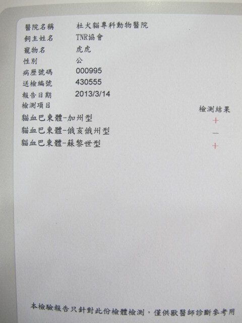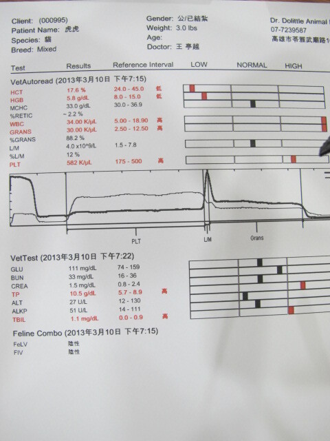 主題: 愛河邊 喝大量水 不吃 毛髒亂的貓 申請者姓名: 劉素鳳 花色: 申請日期: 2013-03-31 00:48:01 申請者部落格: 申請者臉書網址: 所在縣市/合作醫院: 高雄市/恩澤動物醫院 治療費用: 11920元 需求人數: 26人 已結案 (2013-09-03 16:13:34) 報名人員: Joba Huang(已付款)、ki麻(已付款)、YuLun Liu(已付款)、Hui Mei Chen(已付款)、Hui Mei Chen x4(已付款)、Martin Chen(已付款)、Queena(已付款)、Nini Chao(已付款)、Kasie Sun(已付款)、吳麗娟(已付款)、劉怡密(已付款)、小七(已付款)、Thomas Lo、Kim Meng(已付款)、GreenFire(已付款)、Emily Tang(已付款)、邱小祈、Cookie Go(已付款)、Viana Yin(已付款)、Viana Yin(已付款)、yushi0304(已付款)、Chaotsu Lin(已付款)、Searph Chen(已付款)、sharonhuang9(已付款)、Rosalind Tsai(已付款)、 候補人員: 動物病情說明: 虎虎是我早期紮的貓咪,近期發現食慾減退,罐頭也不吃.只拚命喝水,原本漂亮整齊乾靜的毛,也變得雜亂無章,故誘補送醫.經檢查發現貓咪有血巴東蟲的問題需長期投藥,為節省住院費用,故帶回家裡照顧,並依照醫囑投藥且按時回診確認,其醫療明細如下: