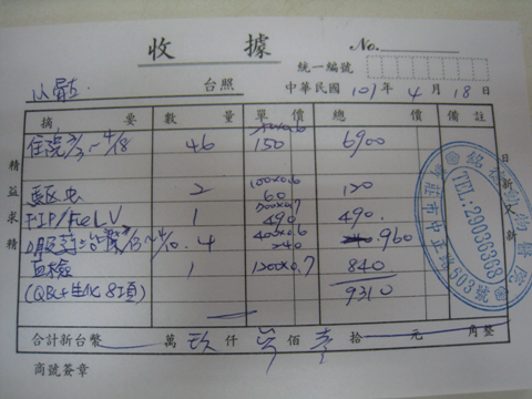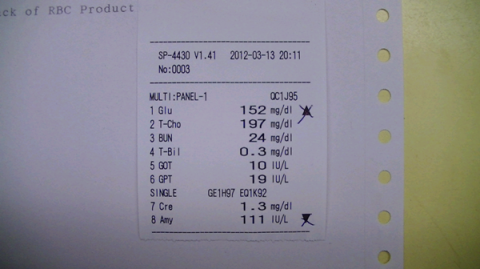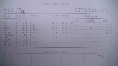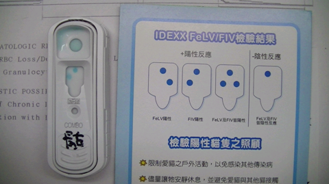 血檢結果顯示有貓愛滋病的感染,與瀕臨輸血邊緣的貧血情況。白血球偏高。