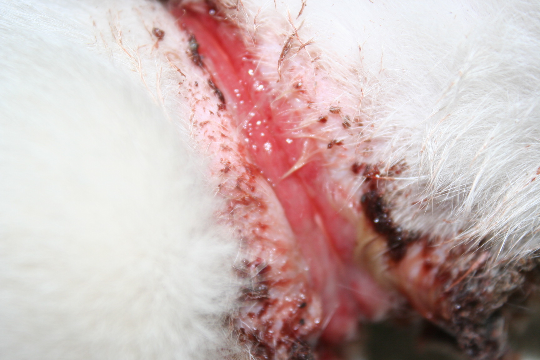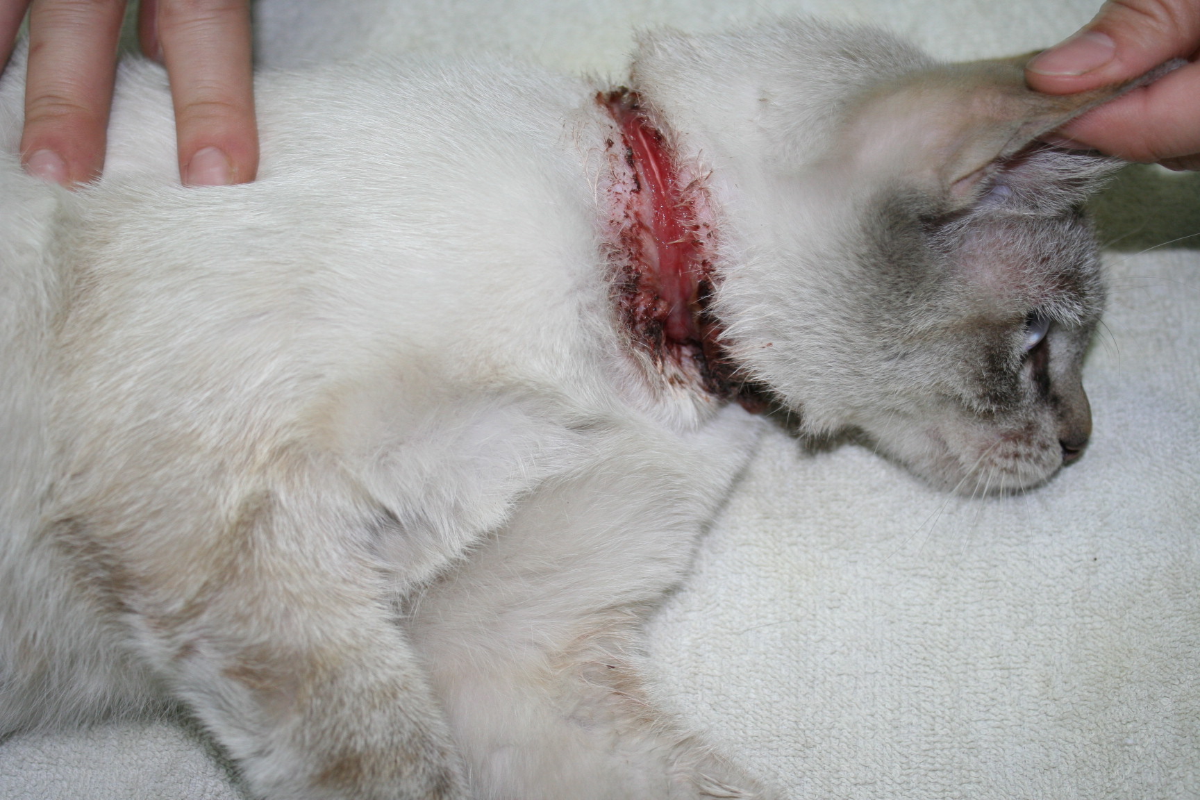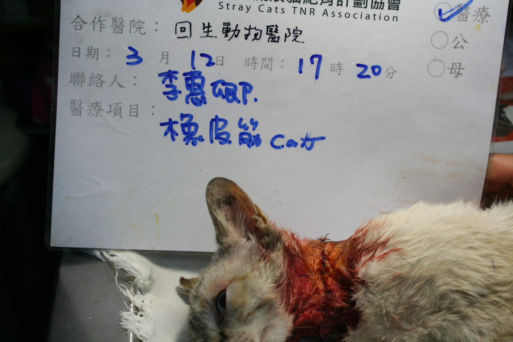 主題: 橡皮筋束脖子..已割開皮膚.皮下組織的可憐貓咪 申請者姓名: 李惠卿 花色: 申請日期: 2013-04-22 14:02:38 申請者部落格: 申請者臉書網址: 所在縣市/合作醫院: 高雄市/回生動物醫院 治療費用: 17100元 需求人數: 18人 已結案 (2013-06-27 14:24:39) 報名人員: Satie Tang(已付款)、Angel Li x2(已付款)、peiyu(已付款)、Sandy(已付款)、Bei Yi Su(已付款)、Ping Hussard(已付款)、鐘睦涵(已付款)、HSU OG(已付款)、鬆餅(已付款)、詭貓(已付款)、緹福♥傳遞味覺空間(已付款)、緹福♥傳遞味覺空間、heaven730(已付款)、Elly Chen(已付款)、Nahlon Chen(已付款)、euca(已付款)、Huimin Liu(已付款)、Jin-yi Chen(已付款)、 候補人員: 動物病情說明: 餵養區的新臉孔..初次看到以為是帶著項圈.仔細看不得了竟是項皮筋束在脖子處.而且已非常深入皮膚..所以趕快誘補送醫..經回生吳醫師初步判斷..貓咪的橡皮筋已割開皮膚.皮下組織.酯肪層.肌肉組織.幸好尚未傷到食道及氣管.先清創後.整理並縫合傷口.令外3/24+4/10 再做2次的清創縫合.貓咪已於4/18