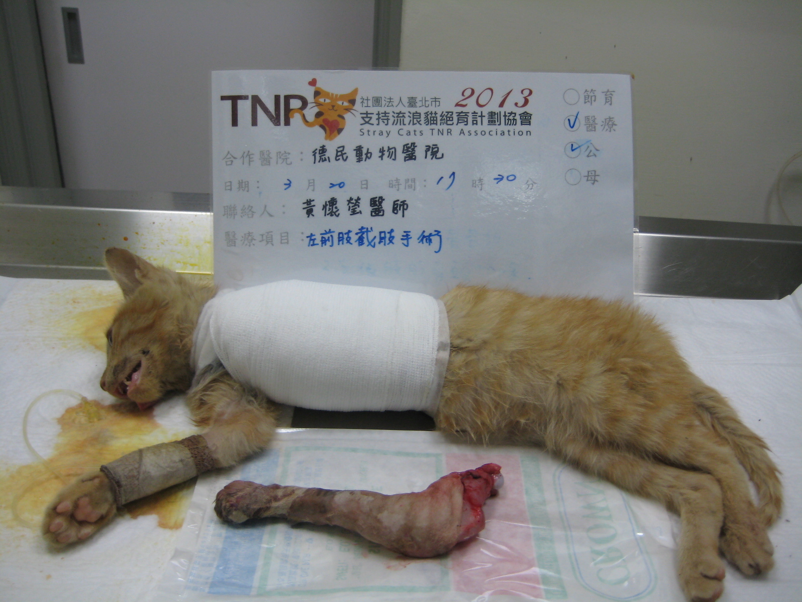 送至德民動物醫院.醫師檢查後說明骨頭沒斷.先清創.只要神經有反應便不需要走到截肢