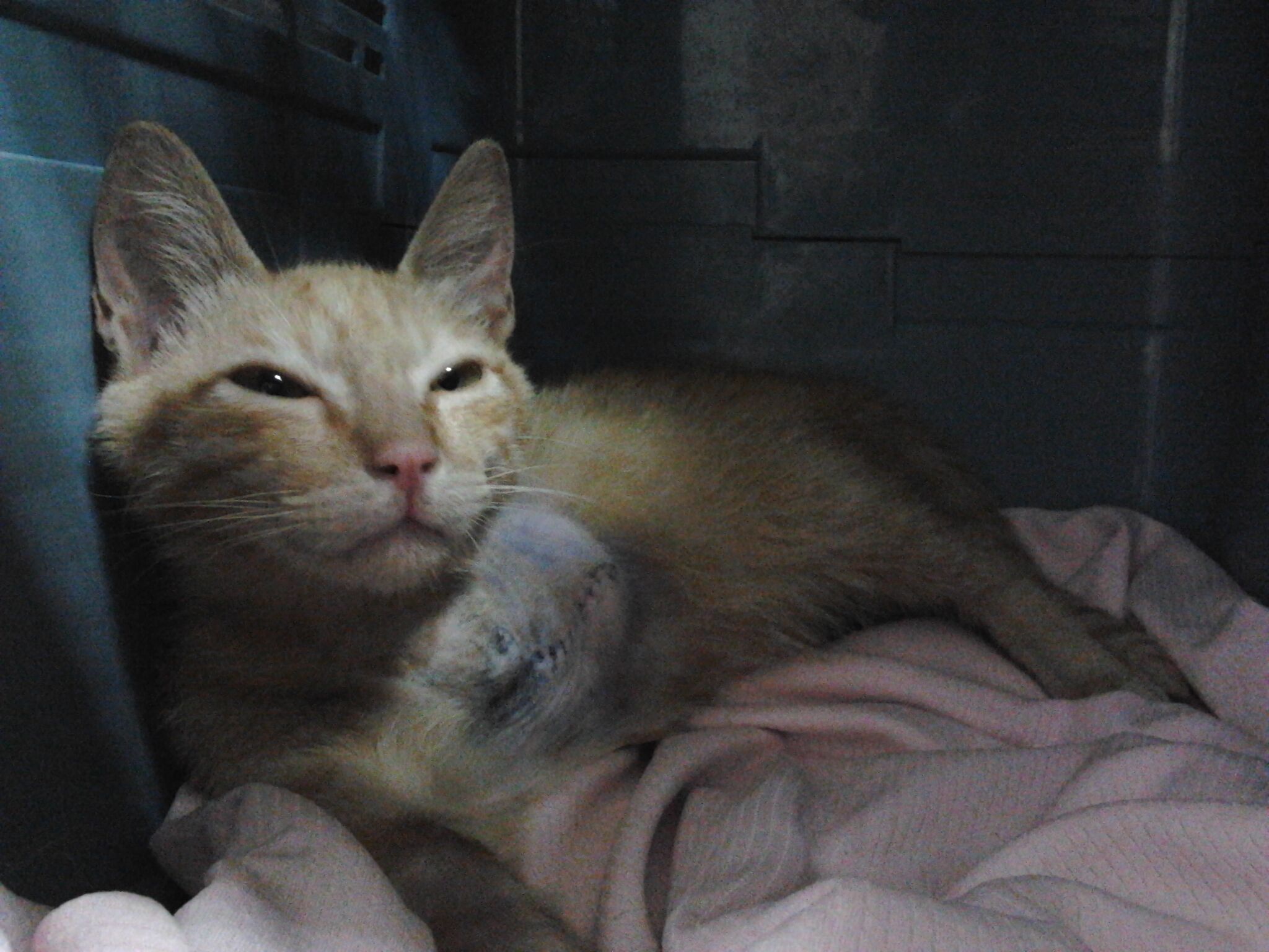 主題: 捕獸夾夾傷小橘貓.暫叫喵嗚 申請者姓名: Js Hung 花色: 申請日期: 2013-04-04 22:26:45 申請者部落格: 申請者臉書網址: 所在縣市/合作醫院: 高雄市/新德民動物醫院 治療費用: 9370元 需求人數: 10人 已結案 (2013-08-06 14:26:33) 報名人員: Eva Shih(已付款)、邱惠卿(已付款)、布蘭卡小姐(已付款)、YiLing Li(已付款)、黃秀雯(已付款)、philip(已付款)、mina(已付款)、chiawei(已付款)、Sean Chun-hsiang Yo、Coraline Lin(已付款)、鍾艾霖(已付款)、 候補人員: 陳小比、Vivian Shih、 動物病情說明: 3/18早上捕捉到被捕獸夾夾住左前腳的小橘虎斑(約3-4個月大).這是2月起的第2隻傷貓