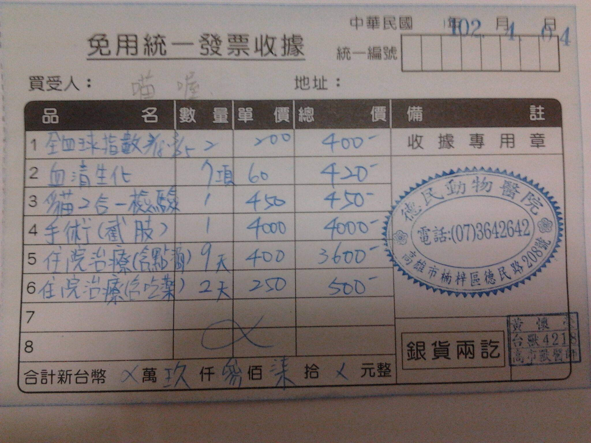 共計9370元動物近況說明: 目前貓在本人家暫時安置.