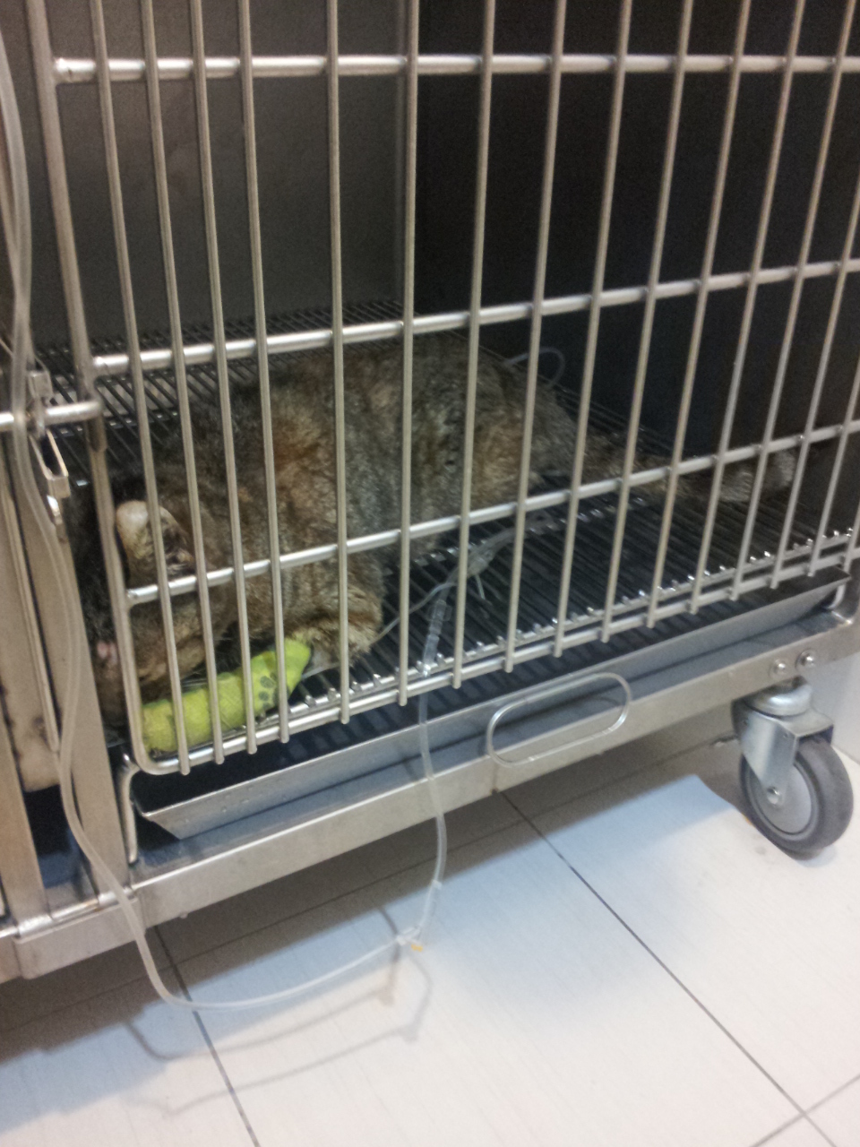 3/28 晚上我到啄木鳥去看貓咪,叫他他完全沒反應癱軟在籠子裡睡著,我問了醫生他的情況,醫生說目前貓咪要靠灌食了,如果把貓咪吵醒的話他會有神經症狀出現,會瘋狂的抓籠子並且一直叫,而我卻還期盼著是否有個奇蹟可以出現不要讓一個生命就這樣這麼不舒服的離開這個世界