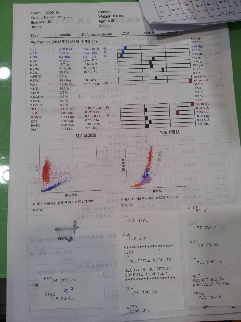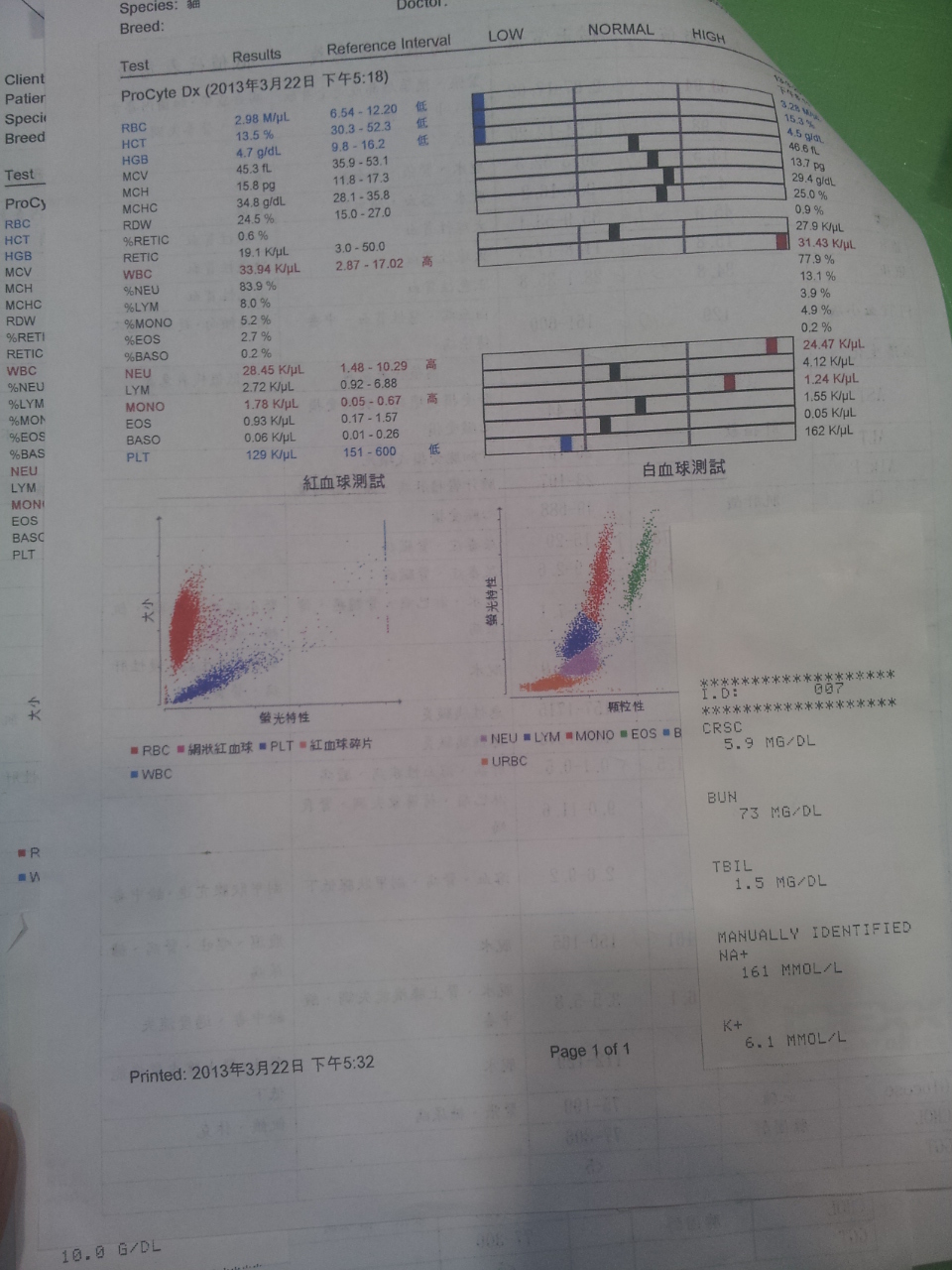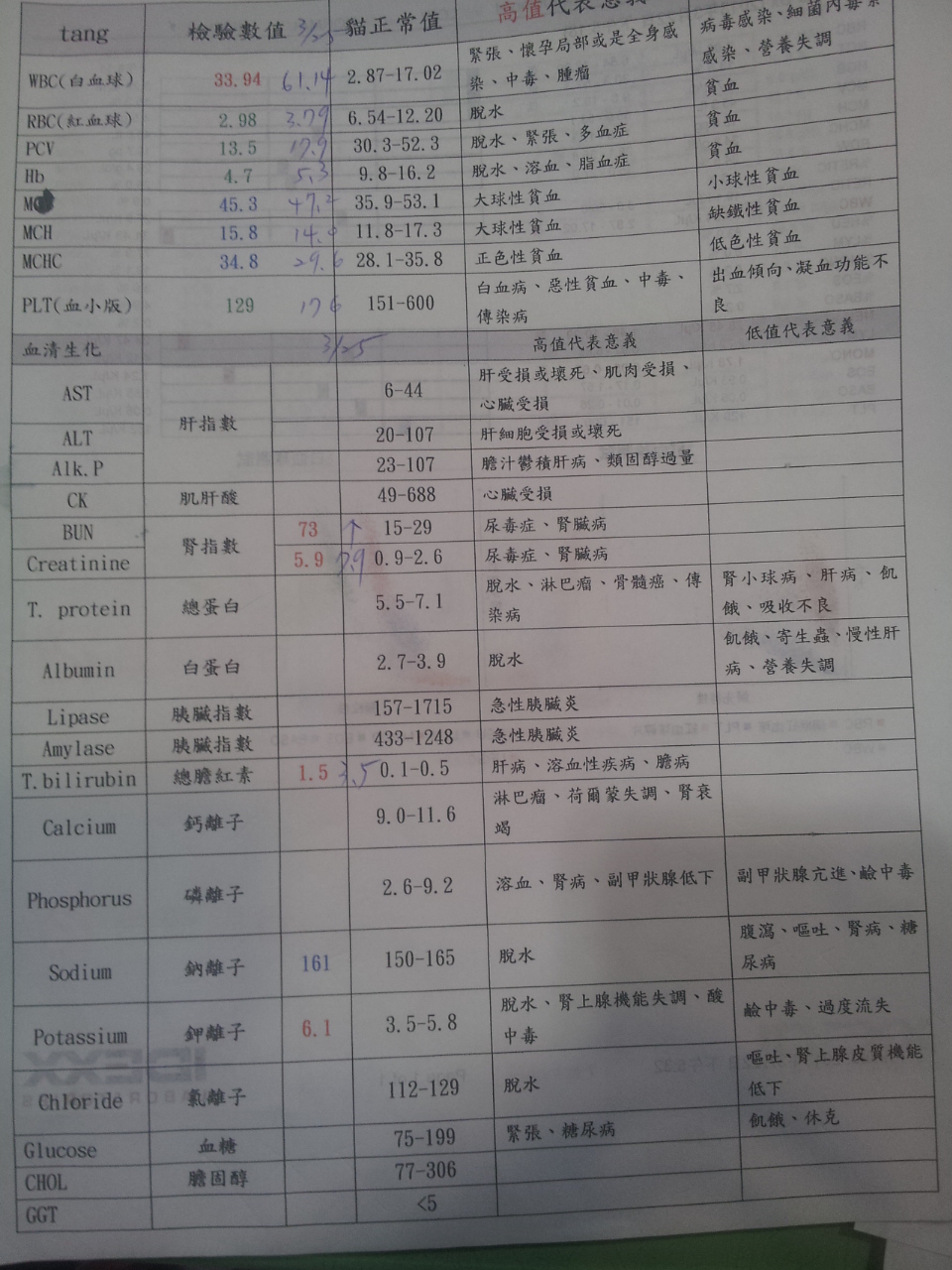 3/22 醫生打電話跟我說目前小貓的腎指數有好轉一些,我和學妹很高興並且希望他是急性腎衰可以治癒,希望快點帶他回家去做照顧;但醫生說雖然輸完血但是紅血球仍然沒有比較提高,維持在13.2