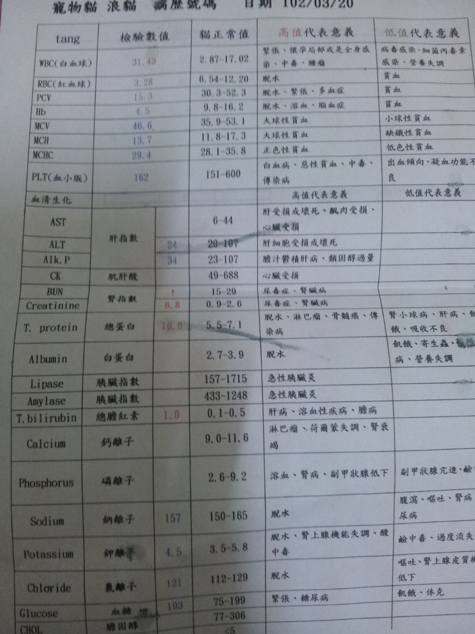 3/25 下午我與朋友去看過貓咪後,發現他一直叫不停,與之前不太一樣;晚上接到電話,醫生說貓咪狀況惡化,驗血後發現應該是得了酸血症,且醫生幫貓咪掃了超音波後發現腎臟已經不是正常形狀了,當天有幫貓咪施打鹼性物質,但因為他是8歲的貓咪了,所以怕會產生過敏症狀很危險