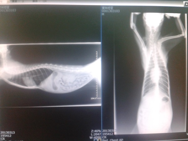 在送醫檢查後,照X光時確定是肺部支氣管炎,許多小支氣管都在發炎..已經生病有一陣子了,所以才會完全沒食慾..不肯進食