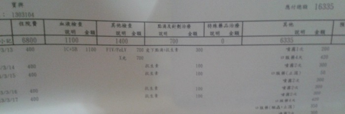 貓已經接出院..至於肺部呼吸道感冒很明顯還沒好..要再後續照顧(水喝很多)+吃抗生素藥.補血品.呼吸道噴霧..
