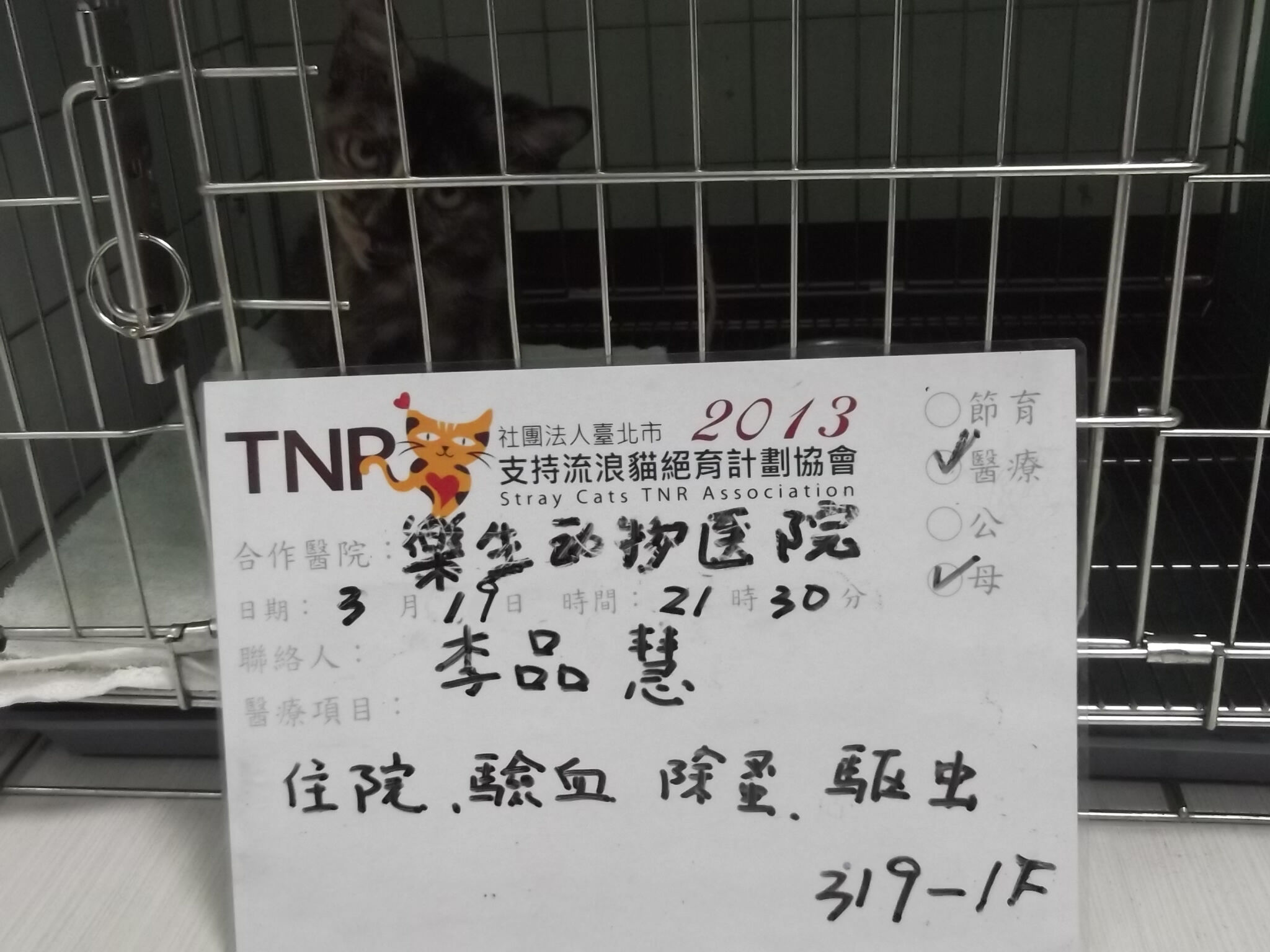 到十全國小繼續誘捕結紮時,看到這隻貓頭歪歪不正常,因此誘捕到醫院給樂生動物醫院給醫生看看,後醫生致電告知有病毒性鼻氣管炎的現象及眼疾,歪頭可能是頭有傷到,大便有蛔蟲,會再作進一步檢查治療,費用的部分須等醫生後續告知..