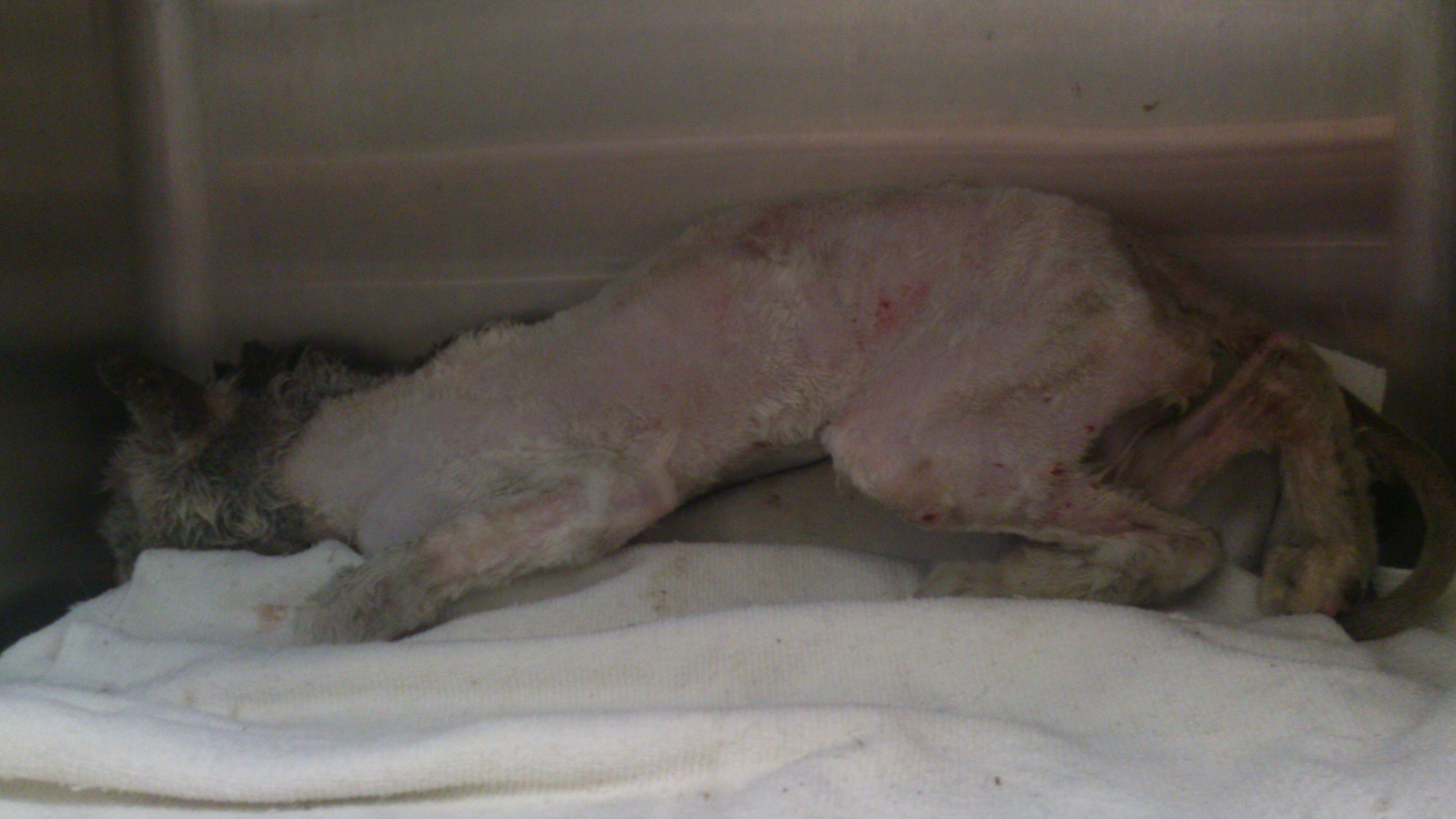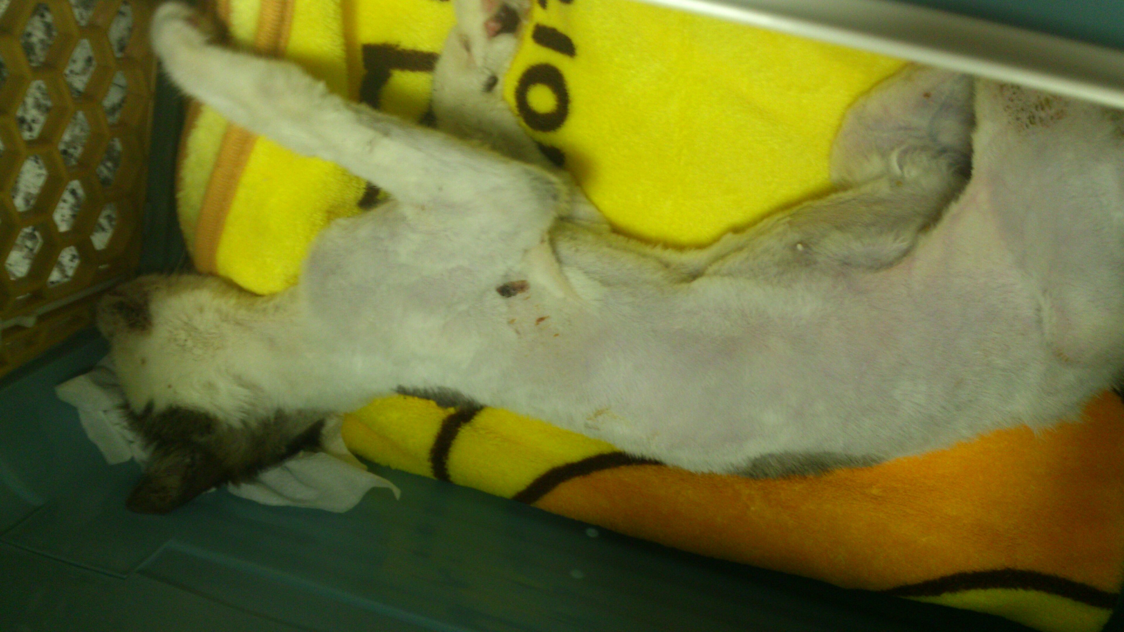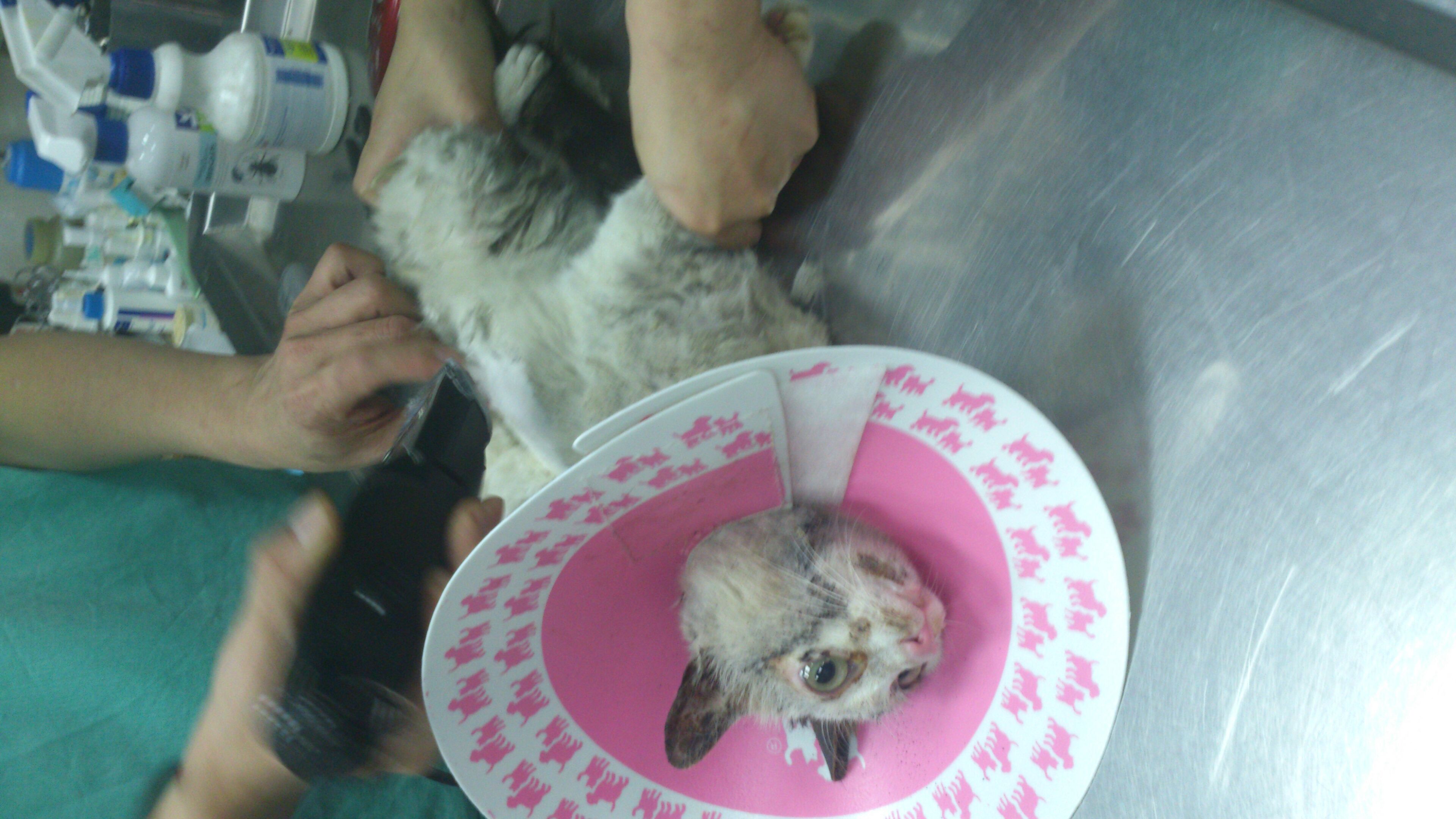 主題: .疑是車禍受傷沒有醫療倒至渾身僵硬.不能行動的貓咪 申請者姓名: 李惠卿 花色: 申請日期: 2013-04-12 17:20:11 申請者部落格: 申請者臉書網址: 所在縣市/合作醫院: 高雄市/回生動物醫院 治療費用: 6200元 需求人數: 7人 已結案 (2013-06-27 14:31:08) 報名人員: 家有三色喵(已付款)、詩詩(已付款)、Pei Shan Lee(已付款)、啾墨韶(已付款)、chiawei x2(已付款)、戀糖bear(已付款)、 候補人員: 動物病情說明: 學生坡網求救的貓咪.一到現場發現貓咪情況非常糟.骨瘦如材.直接就用抱的帶到醫院.貓咪骨頭懷疑是曾經車禍或外力受傷.沒有治療.骨頭不正常的增生.導致渾身僵硬.連頭都無法轉動..貓咪送醫時只能採取保守支持性的治療.灌食營養品..住院十天 後由通報的學生們接回照顧..醫療費用需要大家的幫忙.4000(4/2-4/11 400*10 住院費)+4/2洗澡剪毛600+4/2.4/3 X光片 (400*4)1600=6200
