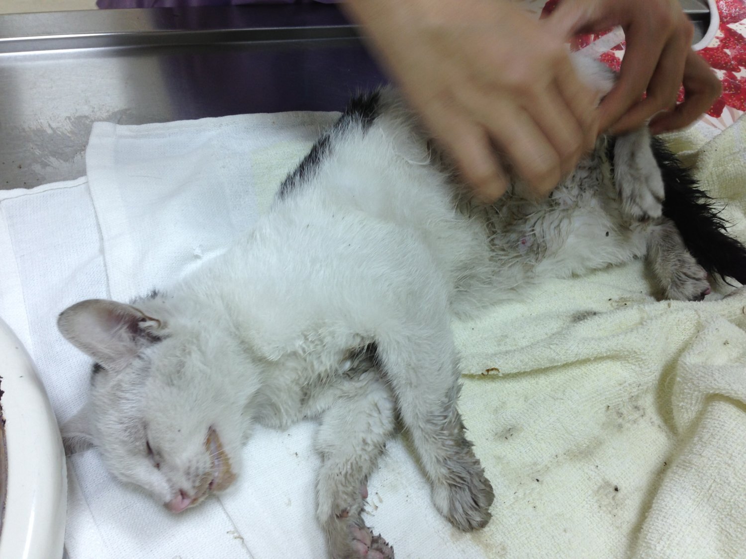 送到醫院後,貓己非常虛弱,經初步檢查,小貓並無明顯外傷,X光顯示,腹部似乎有受到撞擊,而有腫脹的現像,經過醫院搶救,仍然無法救回小貓一命,於下午死亡,並由醫院安排,幫小貓火化。