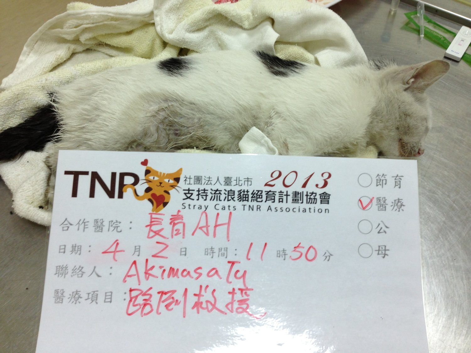 主題: 來不及長大的西門町路倒小貓 申請者姓名: 臺北市支持流浪貓絕育計劃協會 花色: 申請日期: 2013-04-11 17:55:19 申請者部落格: https://www.facebook.com/SupportTNR 申請者臉書網址: 所在縣市/合作醫院: 台北市/長青動物醫院 治療費用: 4950元 需求人數: 11人 已結案 (2013-08-06 14:21:45) 報名人員: Jolie Lin、TOM WANG(已付款)、Chloe(已付款)、Winnie Chen x2(已付款)、貓兔(已付款)、Jamie(已付款)、Vincent Ho(已付款)、林雅雯(已付款)、ailsa x2(已付款)、Yumi Yu(已付款)、 候補人員: 陳信良、 動物病情說明: 經粉絲團通報,一幼貓於西寧南路熱鬧的西門町,一間商店的門口,無法自己移動,志工前去救援。