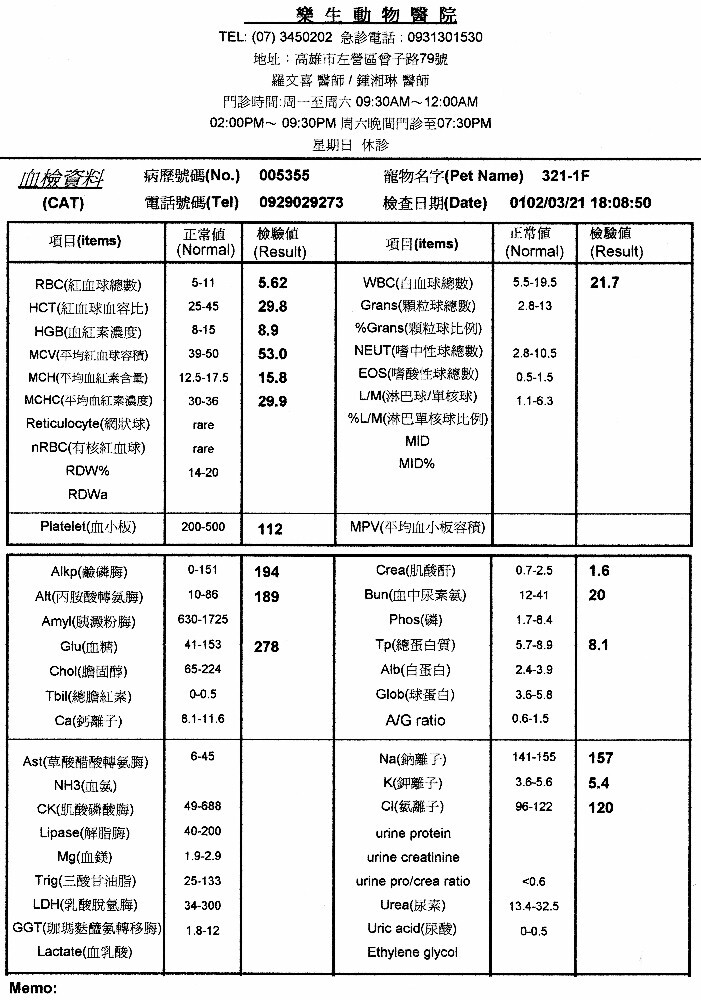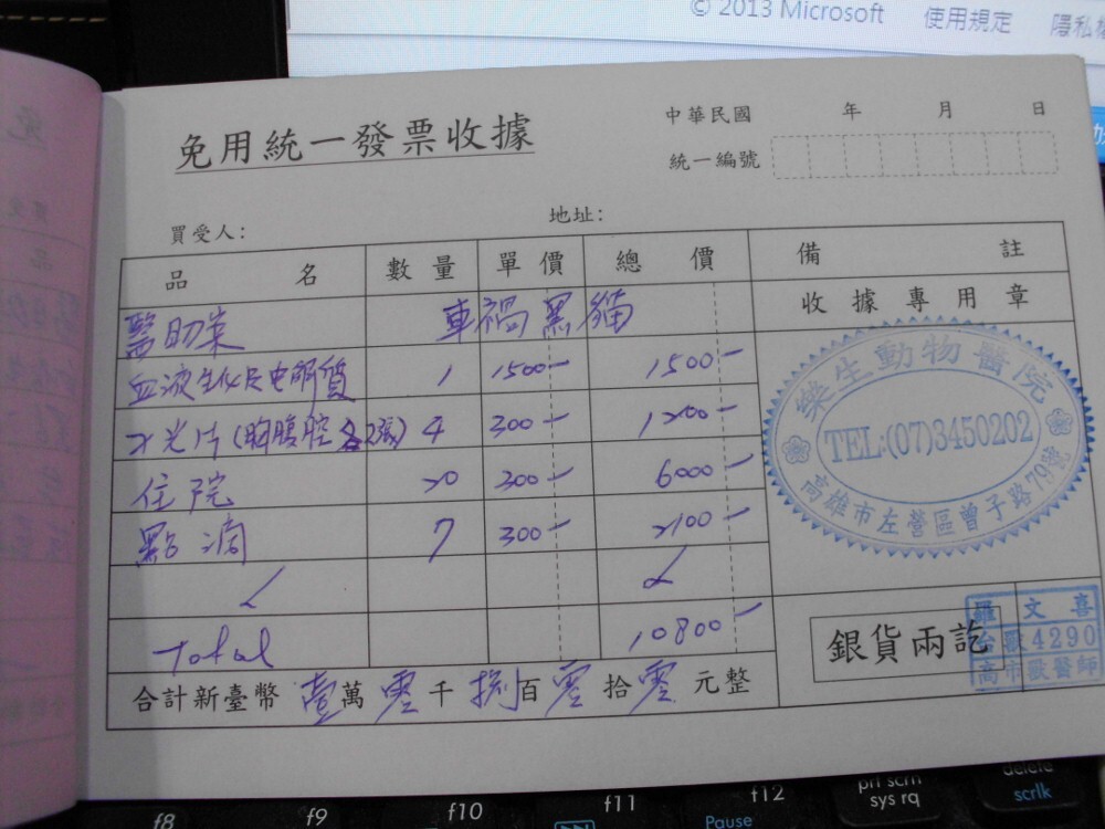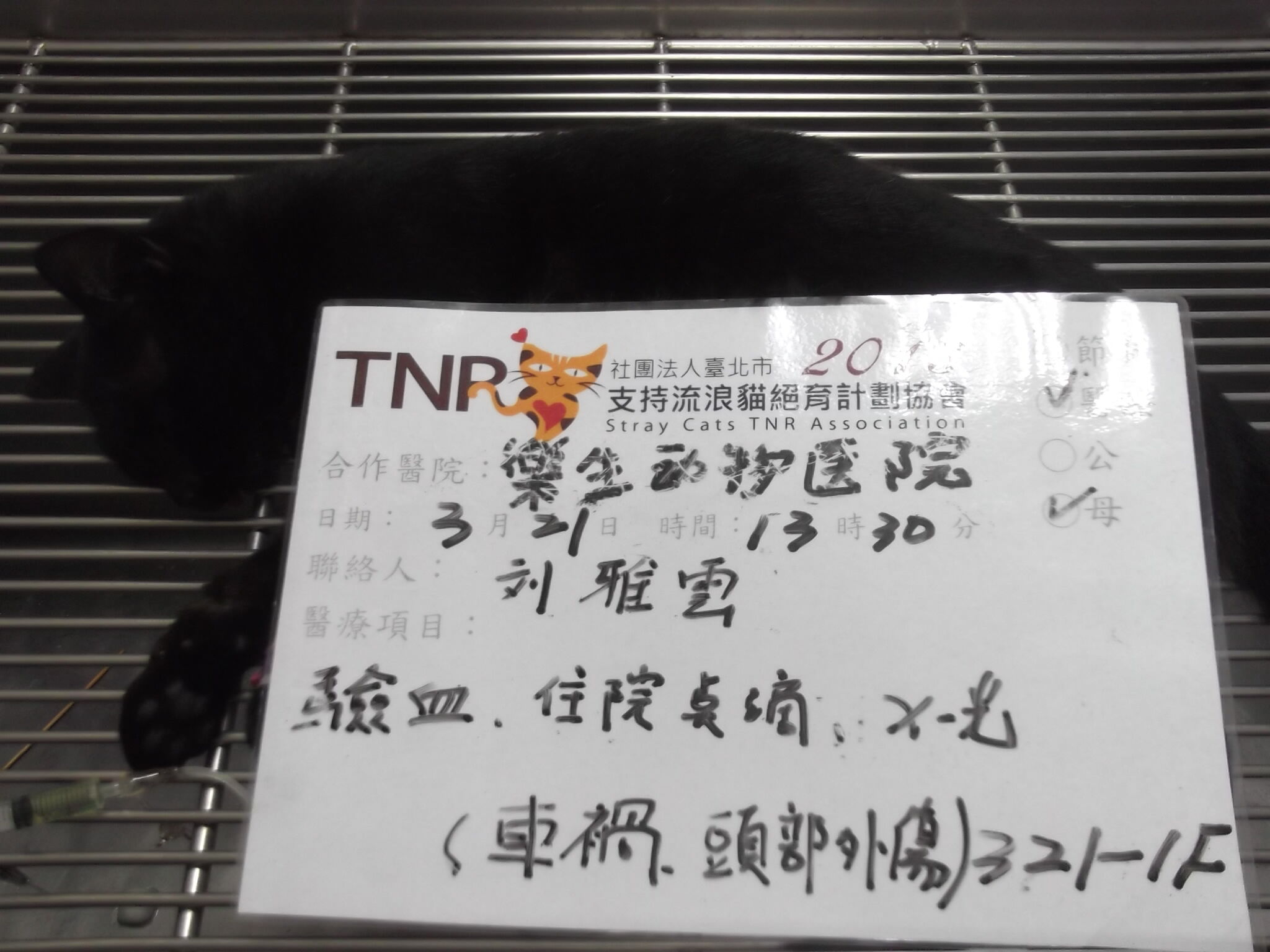 主題: 明道路 路倒嘴有血的黑貓 申請者姓名: 劉雅雲 花色: 申請日期: 2013-04-17 22:15:17 申請者部落格: 申請者臉書網址: 所在縣市/合作醫院: 高雄市/樂生動物醫院 治療費用: 10800元 需求人數: 23人 已結案 (2013-09-03 16:23:17) 報名人員: Jessie Chen x3(已付款)、董珈瑄(已付款)、周妍鈞(已付款)、Tin H(已付款)、楊閔華(已付款)、何偉靖(已付款)、郭小翼、謝佩芳(已付款)、Amy Li(已付款)、Rebecta Su、林廷軒(已付款)、馬豆漿 x2(已付款)、acctgbaby(已付款)、Anq Liao x2(已付款)、Angel Chou(已付款)、Marlie Sinma、Marlie Sinma、Eva Lee(已付款)、Alison Lee(已付款)、Lynn Lin(已付款)、MiniMe Chen(已付款)、Ya Shin Yang、Ya Shin Yang(已付款)、惠惠(已付款)、 候補人員: 動物病情說明: 3/21的中午在明正國小餵食區剛下車要放飼料就看到旁邊明道路上有一隻黑貓在路旁轉圈圈, 以為他在追昆蟲, 越看越奇怪他偏到路邊就趴下了. 過去看發現他嘴角有血應該是被車撞了, 貓躺在地方不太能移動, 趕快用洗衣網把他裝起來, 然後帶到醫院就醫, 發現此貓咪有剪耳, 是我在1月份結過紮原放的浪貓, 還好我在旁餵食剛好看到. 貓咪就醫有腦震盪的現象不吃, 走路會不平衡, 醫生有幫她打點滴, 照x光和血檢並做治療, 現在貓咪已經康復回到她熟悉的地方, 現在每天餵食時會在她那邊的小草地也放一碗飼料.