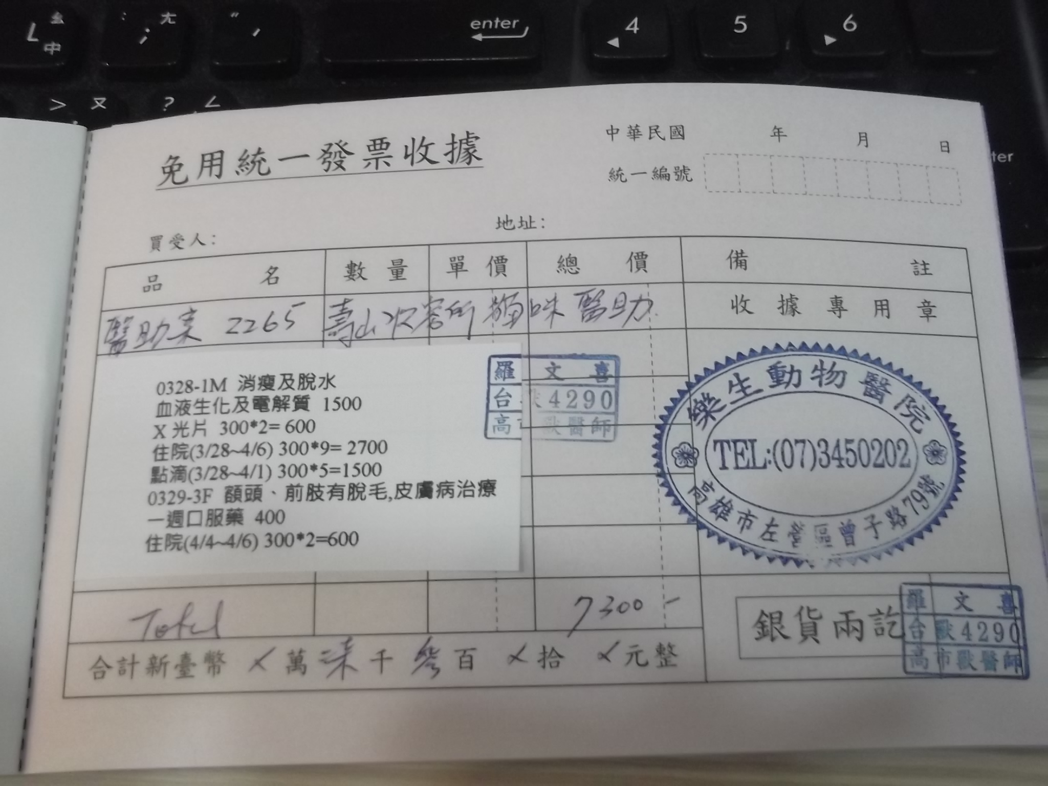 住院(3/28~4/6) 300*9= 2700
