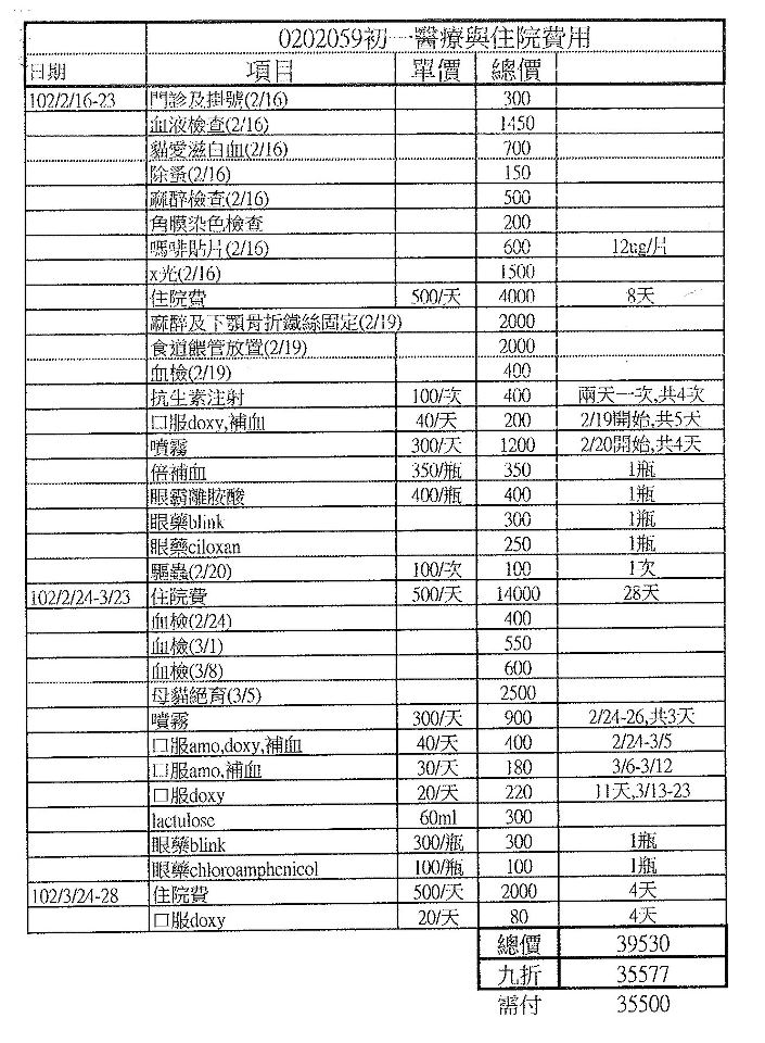 主題: 車禍下顎斷裂親人三花 申請者姓名: 陳曉霏 花色: 申請日期: 2013-04-17 22:53:09 申請者部落格: 申請者臉書網址: 所在縣市/合作醫院: 台北市/其他院所醫助專案(醫院請先MAIL溝通) 治療費用: 35500元 需求人數: 37人 已結案 (2013-08-06 14:20:54) 報名人員: Jessie Chen x2(已付款)、溫鴻(已付款)、Liao Tzuyi(已付款)、不點(已付款)、csaoesc(已付款)、Shian-yuan Chou(已付款)、米塔爾、Sherry Yang(已付款)、真滿足(已付款)、張芳如(已付款)、iMADOKA(已付款)、Lea Yang(已付款)、陳慧伶(已付款)、憂鬱的紫色(已付款)、Miuko Lin(已付款)、櫻桃桃(已付款)、貢丸、Jamie Chiu(已付款)、馬豆漿(已付款)、Christina Chiang x3(已付款)、Hide(已付款)、黃亞凡(已付款)、Chang Huei Syu(已付款)、julie lee、Robin Chang、uknow(已付款)、Ace Sky(已付款)、Tanya(已付款)、柯元傑(已付款)、Ericaca Kung(已付款)、julie lee(已付款)、張凱昕(已付款)、shiauyu(已付款)、shiauyu、鄭家穎(已付款)、sunny(已付款)、Weirong(已付款)、Veara Lin x2(已付款)、 候補人員: 動物病情說明: 過年期間民眾求援協會
