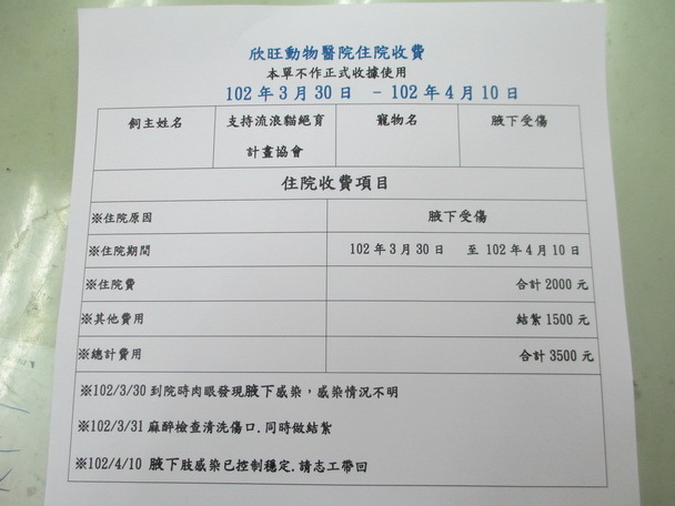 主題: 腋下受傷懷孕母虎斑 申請者姓名: 楊溫蒂 花色: 申請日期: 2013-04-19 01:36:49 申請者部落格: 申請者臉書網址: wendy0510@hotmail.com 所在縣市/合作醫院: 台北市/欣旺動物醫院 治療費用: 3500元 需求人數: 8人 已結案 (2013-06-27 14:33:40) 報名人員: Elaine Yang(已付款)、Emily Chou x5(已付款)、Emily Chou x2(已付款)、 候補人員: 動物病情說明: 20130320李小姐向TNR協會求援的助紮案件.捕抓地點:新店市寶安街6巷2號 動物近況說明: 已放回原地由當地愛媽固定餵食
