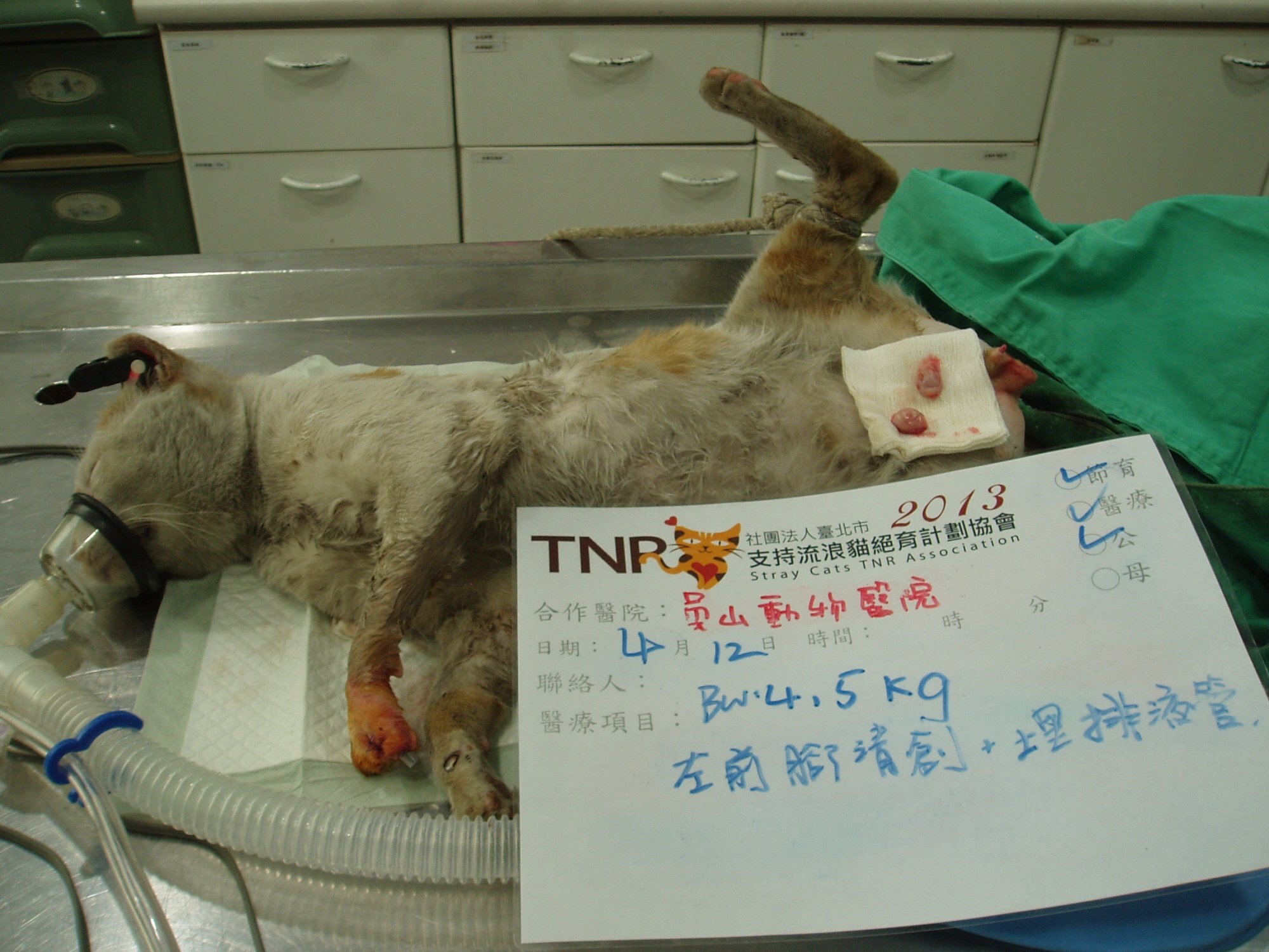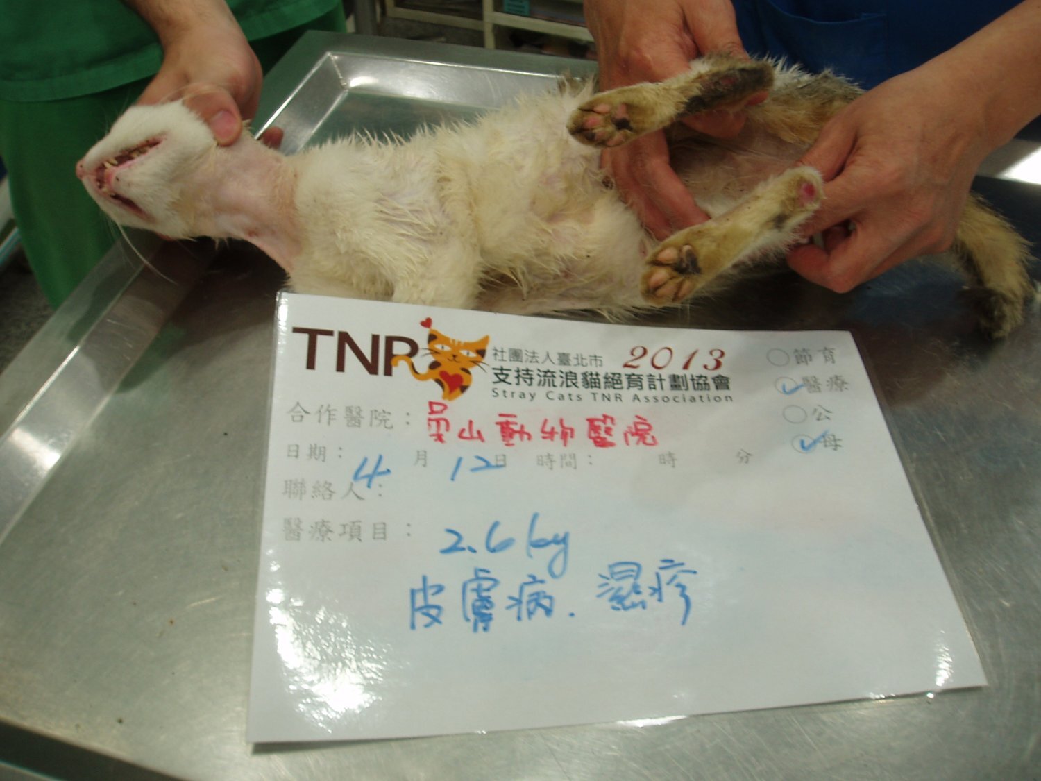 主題: 新埔捷運站TNR誘捕到的傷貓送醫 申請者姓名: 臺北市支持流浪貓絕育計劃協會 花色: 申請日期: 2013-04-25 09:59:07 申請者部落格: 申請者臉書網址: https://www.facebook.com/SupportTNR 所在縣市/合作醫院: 新北市/員山動物醫院 治療費用: 6200元 需求人數: 7人 已結案 (2013-06-27 14:32:39) 報名人員: Summer(已付款)、Richard Hsu(已付款)、Melody Wu(已付款)、Alice Wang(已付款)、Kiwi(已付款)、Doris x2(已付款)、 候補人員: 動物病情說明: 4月13日晚間,協會資深志工跟協會報備,揪團至新埔捷運站,進行TNR,