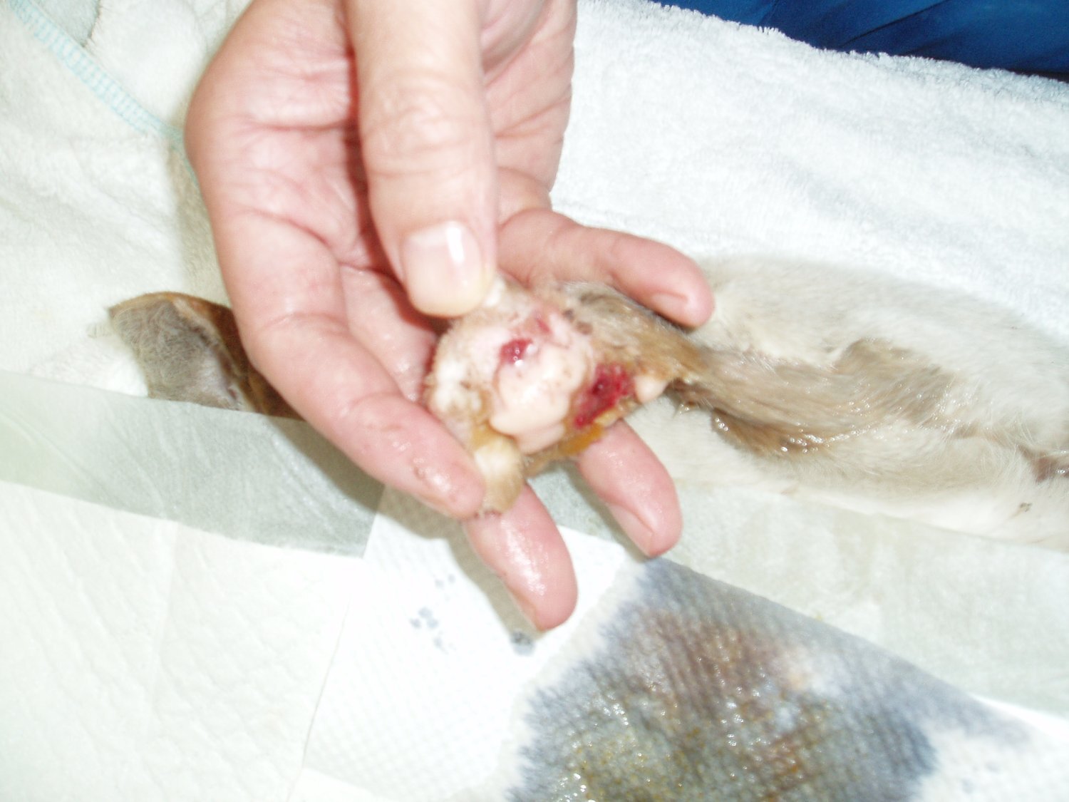 這隻看起來有剪耳的公貓,確未結紮!腳傷則因為有二個腳趾不明原因斷了,經過