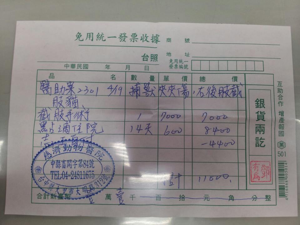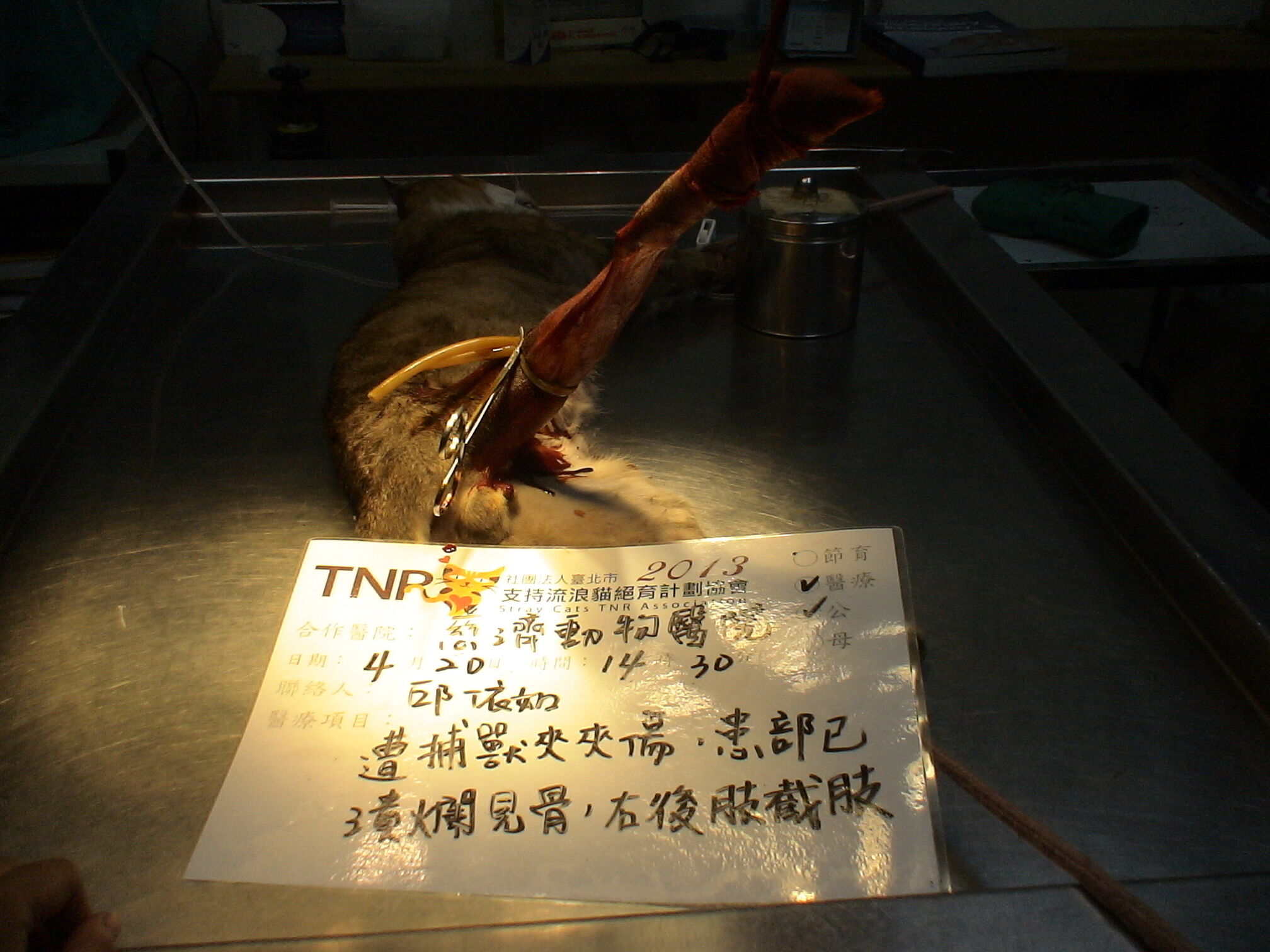 撈到後立刻送往慈濟動物醫院治療,經過醫生判斷,因為後腿腳掌已經潰爛所以必須進行截肢!