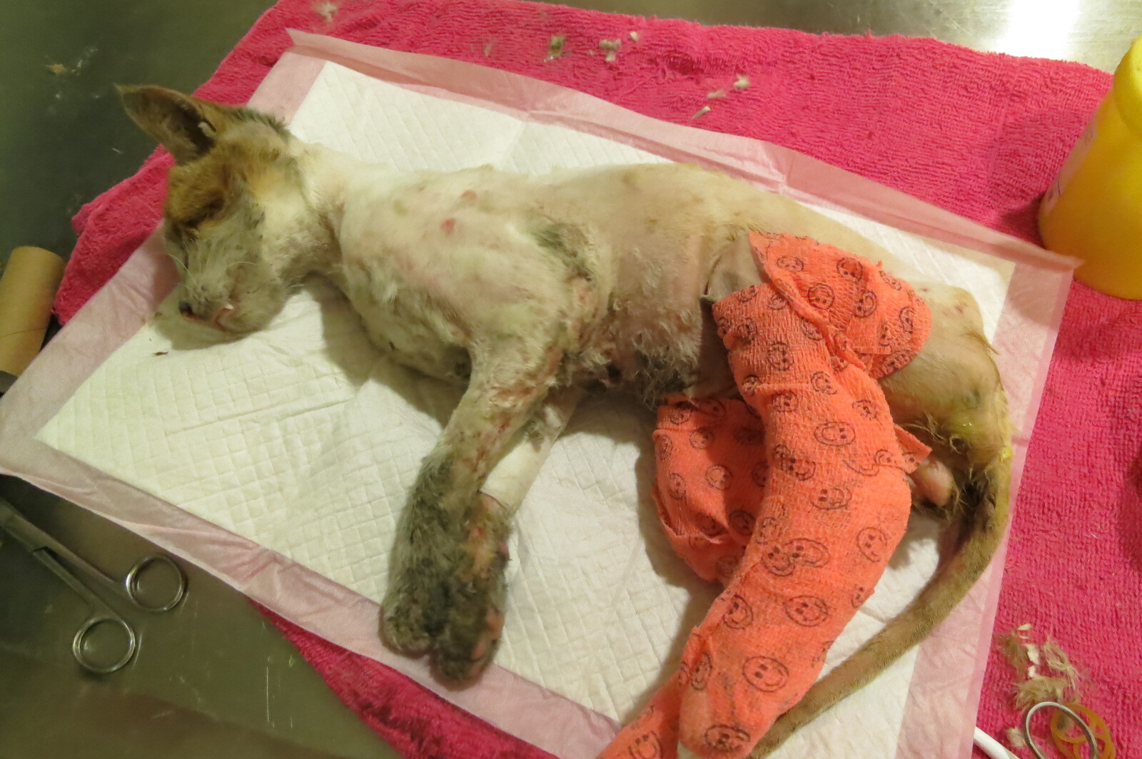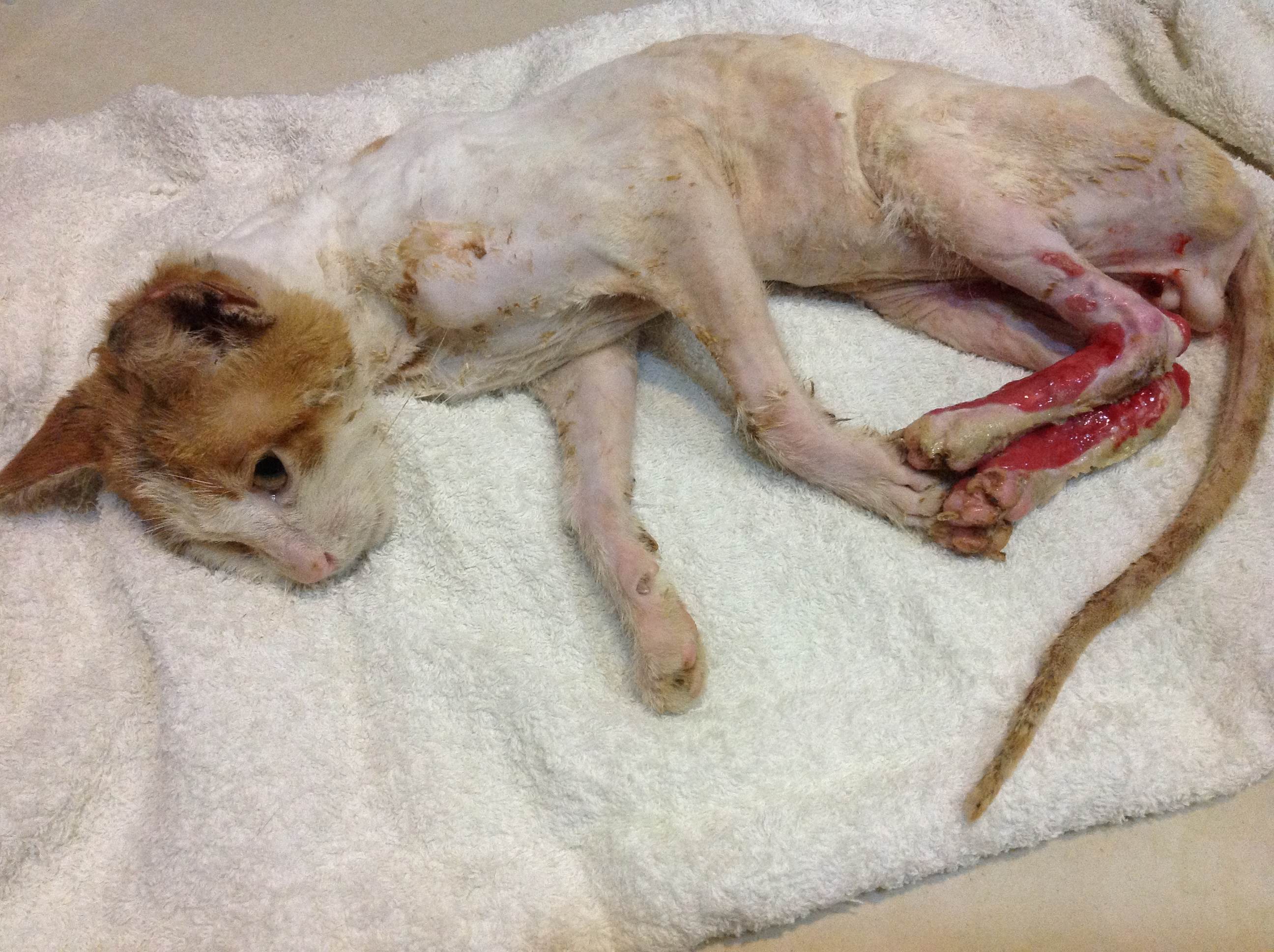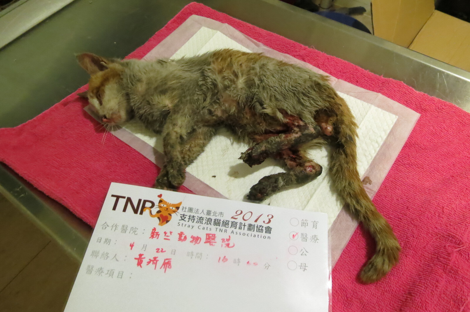 主題: 湳中爛腳傷貓 申請者姓名: 黃琦雁 花色: 申請日期: 2013-06-11 22:30:07 申請者部落格: 申請者臉書網址: 所在縣市/合作醫院: 新竹市/新竺動物醫院 治療費用: 22500元 需求人數: 24人 已結案 (2013-08-06 14:19:58) 報名人員: 緣緣寶貝 x5(已付款)、小瓜、小瓜(已付款)、WeiLin Chen(已付款)、罐頭(已付款)、林韋韋(已付款)、MuMu Lee、Penny Pan x3(已付款)、天真(已付款)、Ea Ting Wu(已付款)、eturia(已付款)、Chu Chung(已付款)、Kimi Hsu(已付款)、黃亞凡(已付款)、Rita Chen(已付款)、劉茜文(已付款)、言則(已付款)、Kelly、波波(已付款)、沒地位的貓奴才(已付款)、蕾絮唯(已付款)、 候補人員: Chianhuei Chu、Wei-wen Chang、 動物病情說明: 20130422 我送TNR的貓去結紮.回程剛好接到電話湳中街有隻病懨懨的貓.需要救援.我就繞過去看.貓咪看起來就是狀況很差了.我就誘捕起來用紙箱裝著.貓身上發出腐臭味.送至醫院治療.醫生麻醉後.發現貓咪的雙腿皮都爛掉了.疑似是瀝青沾黏到毛跟皮.造重雙腳的皮潰爛了.貓也瘦成皮包骨.有感染危險.經過醫院清創與治療..貓咪住院治療一個多月.中間也進行人工皮治療.貓咪很幸運與堅強的活下來了.非常感謝醫院團隊的協助照顧. 動物近況說明: 6月初醫生評估傷口已經有慢慢收合..可帶回照顧2-3個月.只要 每月定期回診檢查.視狀況再進行結紮手術.所以 6/11 我將貓咪帶回家休養與照顧了.等待肉跟皮長回去.