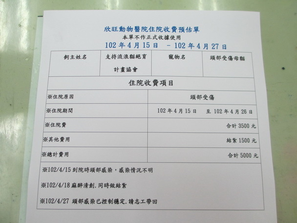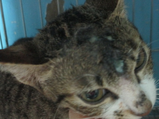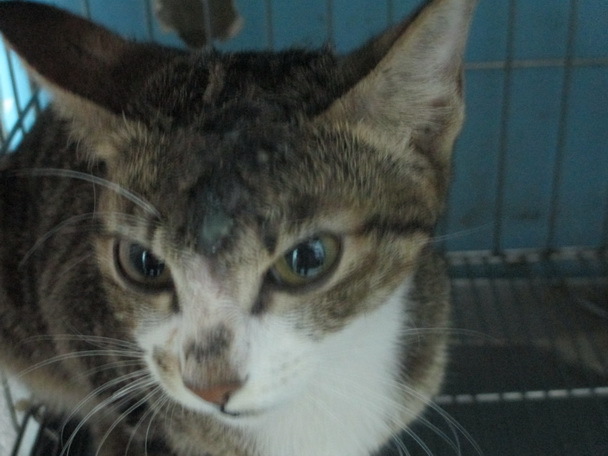主題: 頭頂疑似咬傷潰爛母貓 申請者姓名: 林國書 花色: 申請日期: 2013-04-27 18:16:55 申請者部落格: 申請者臉書網址: 所在縣市/合作醫院: 台北市/欣旺動物醫院 治療費用: 5000元 需求人數: 6人 已結案 (2013-08-06 14:16:28) 報名人員: Bubu Wang(已付款)、Yi Chen Huang、小可(已付款)、rachell(已付款)、lavinia x2(已付款)、小可(已付款)、 候補人員: 動物病情說明: 20130414本來要去永和永亨路救援3月底出院的[永和永亨路脖子受傷貓] 據餵食者曾定宏連絡 因為這隻貓這次全身傷痕累累臉部抓到嚴重禿毛又流血.所以打算再抓去就醫 現場意外出現這隻臉部浮腫.流膿受傷的親人母貓~