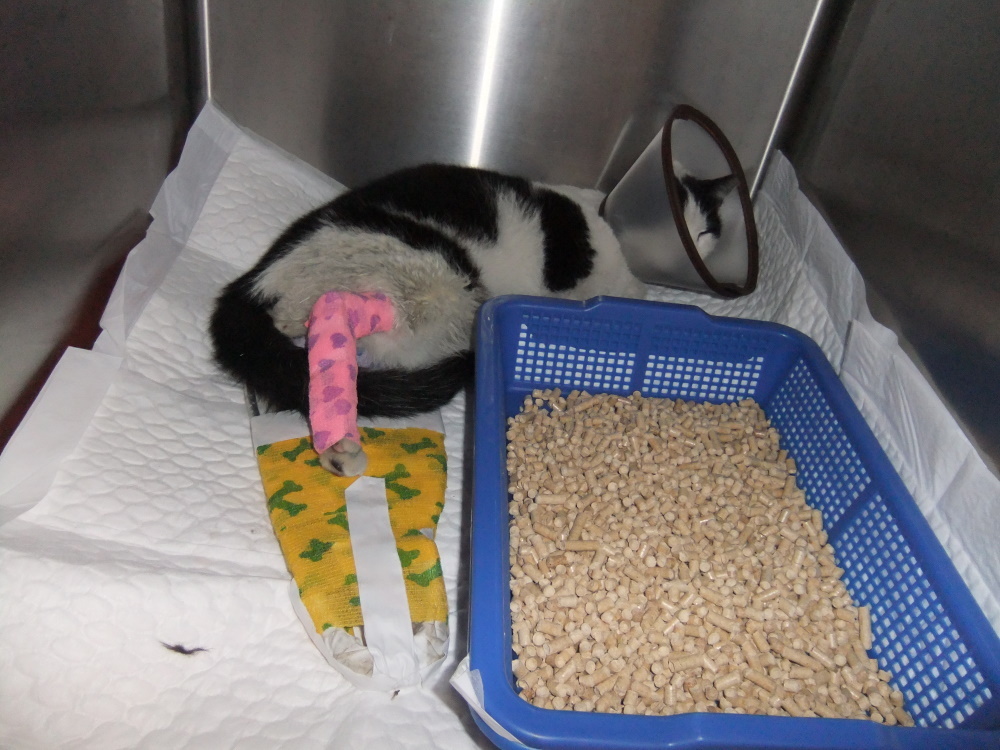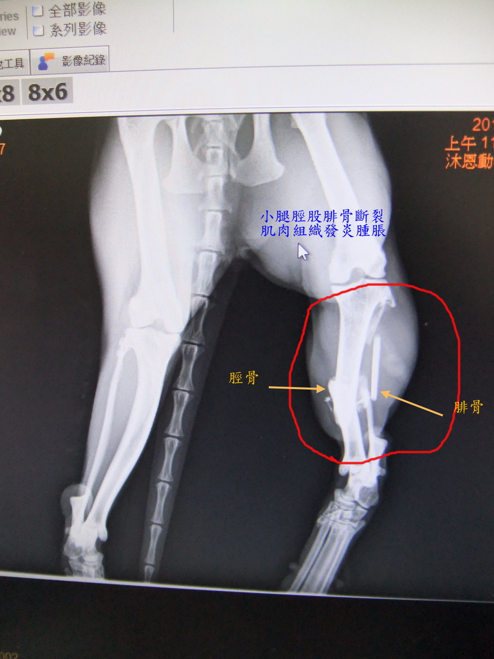 主題: 有家歸不得的乳牛骨折貓--脛骨腓骨斷裂修復手術 申請者姓名: 王惠貞 花色: 申請日期: 2012-04-27 01:20:58 申請者部落格: 申請者臉書網址: 所在縣市/合作醫院: 台北市/其他院所醫助專案(醫院請先MAIL溝通) 治療費用: 15000元 需求人數: 15人 已結案 (2012-06-21 01:13:31) 報名人員: Chi-Ju Chen(已付款)、吳家儀(已付款)、sally(已付款)、sally(已付款)、sally(已付款)、Emilia Chen(已付款)、Ku-ai Gina Chen(已付款)、philip(已付款)、GiMi Li(已付款)、波波(已付款)、張珍妮(已付款)、Hsin-Yi Chiao(已付款)、Shih Ju Chiu(已付款)、Irena(已付款)、Ny To(已付款)、 候補人員: 小舟、小舟、小舟、 動物病情說明: 這隻tnr乳牛貓生活的很坎坷,被「人」盯上,有「里」歸不得,被下令不准待在出生至長大的里,以換取其他貓咪的生活權,一年多來安置不同的志工家,逃跑了兩次,這次逃跑後沒這麼幸運,牠在連棟各大樓鐵皮屋頂上活動兩個月之久,志工頂樓隔間有放飼料及水,但4月中,在消失3天後周六晚被找到,虛脫的倒在巷子旁,經協會幫助,緊急先送最近的動物醫院,醫生驗血報告所有指數都很高,嚴重脫水,左小腿研判骨折,可能從高處掉落有三天之久沒進食喝水,先住院打點滴期盼指數恢復正常,由於醫院沒x光機、開刀台,週一轉至沐恩動物醫院治療,x光片顯示左小腿脛骨腓骨斷裂,右腿骨板根部關節處傷口深,有發炎,部分血指數有下降但肝腎指數仍高,醫生週四才能開刀打骨鈑,所以先作了骨架並住院觀察,目前術後傷口恢復不錯但食慾極差,為省醫療費自行帶回照顧,希望他能打起精神恢復以前愛吃愛叫的個性,並繼續和我們一起尋找能夠自由與幸福並存的地方,住院及開刀醫療費用兩家醫院2870+27855=30725,費用對我們來說負擔高,需15000元幫助,希望大家一起幫忙,一人1000元!剩餘醫療費及後續取出骨鈑費用我們自行負擔,以節省資金可救助其他之貓咪